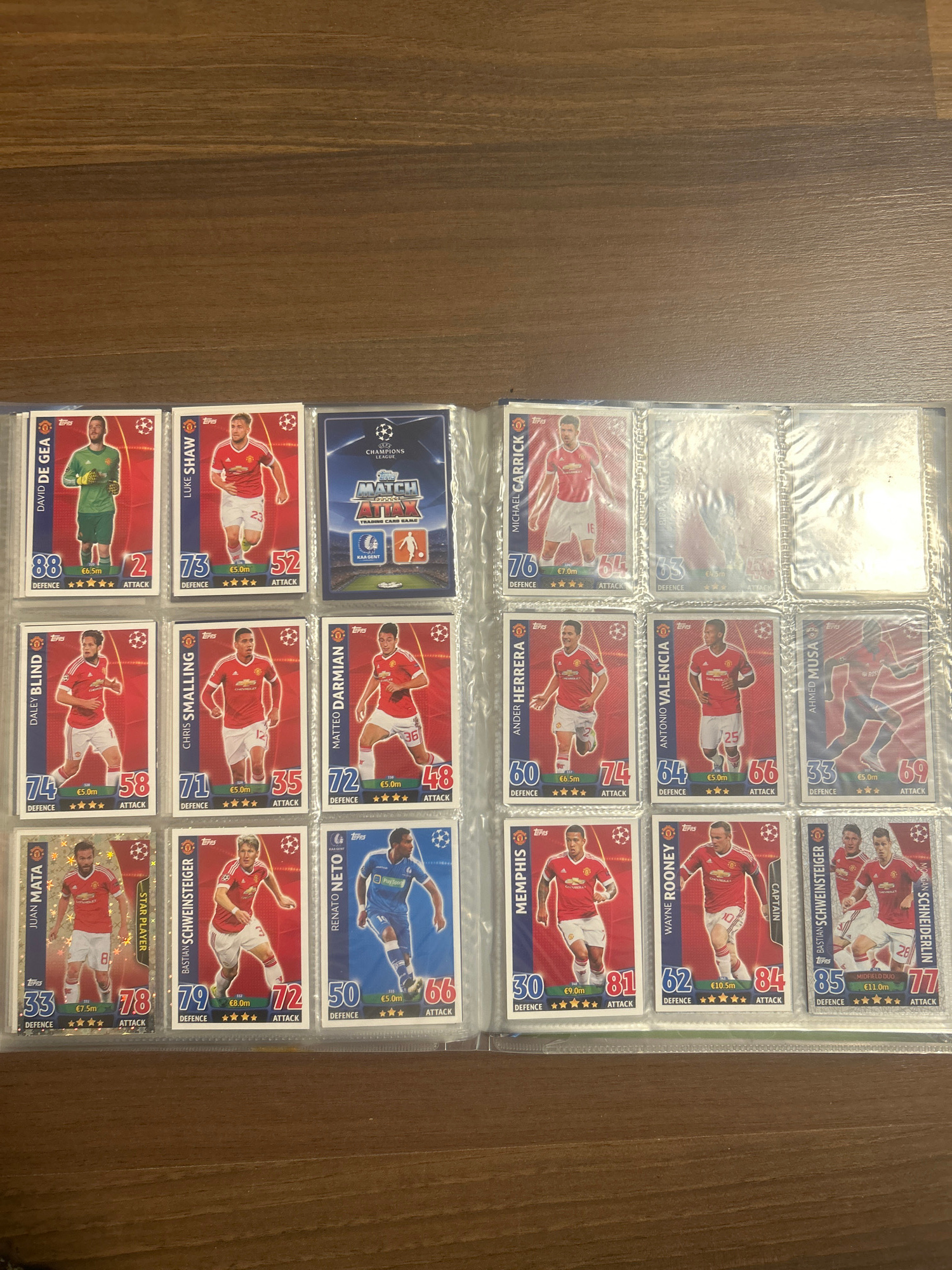 The image shows a collection of football trading cards in a plastic sleeve binder. The cards are from a "Match Attax" Champions League series, featuring various football players. Most of the cards sho…read more