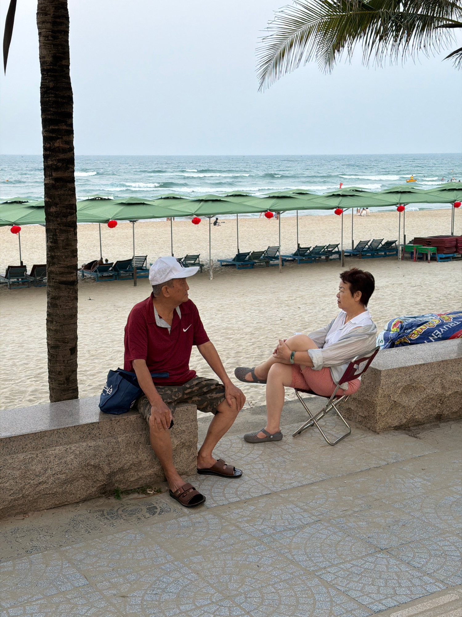 This image depicts a beach scene in Đà Nẵng, Vietnam. In the background, there is a view of the beach, ocean, and sky. Rows of green beach umbrellas with red accents line the sand. In the foreground,…read more