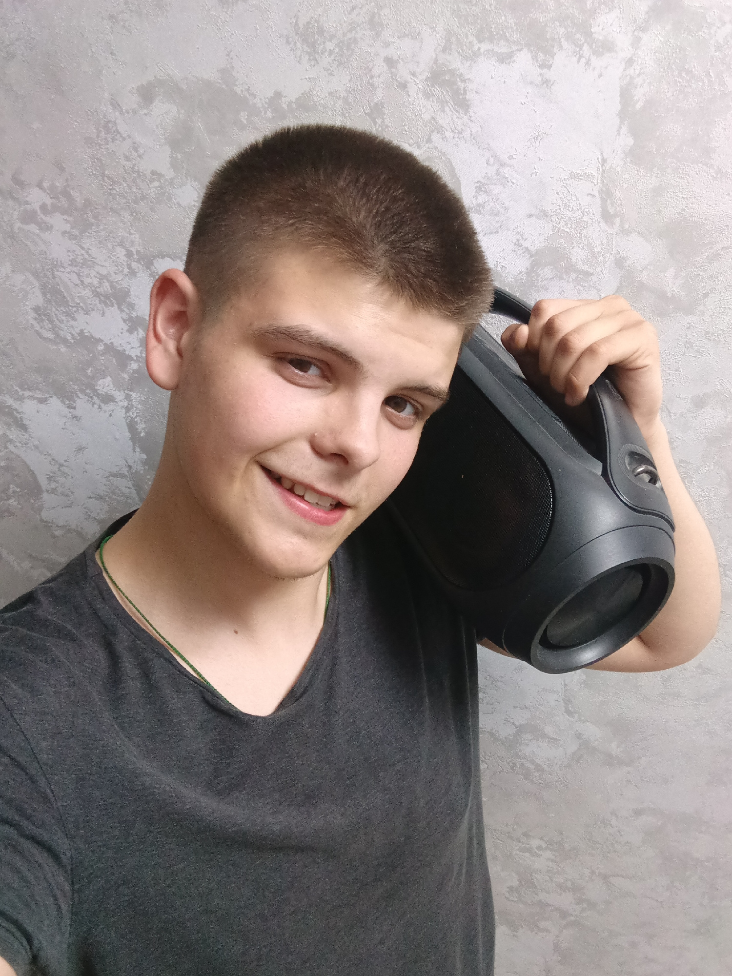 A young male stands facing the camera with a slight smile, holding a black boombox against his right shoulder. He has short, brown hair and wears a gray V-neck t-shirt and a necklace. The background i…read more