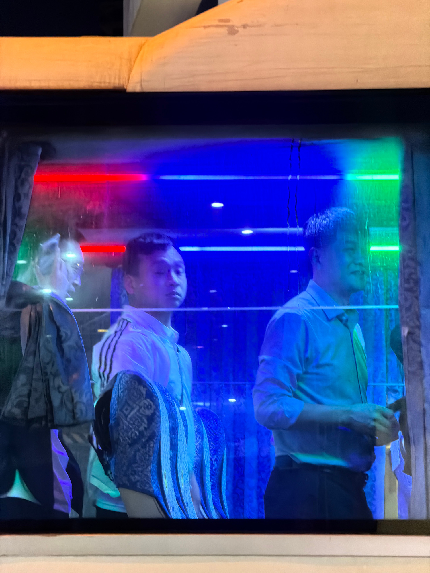 A vertical, indoor photograph depicts a television screen displaying a scene with two men. The screen features a modern aesthetic with illuminated red, blue, and green vertical lines. One man, dressed…read more