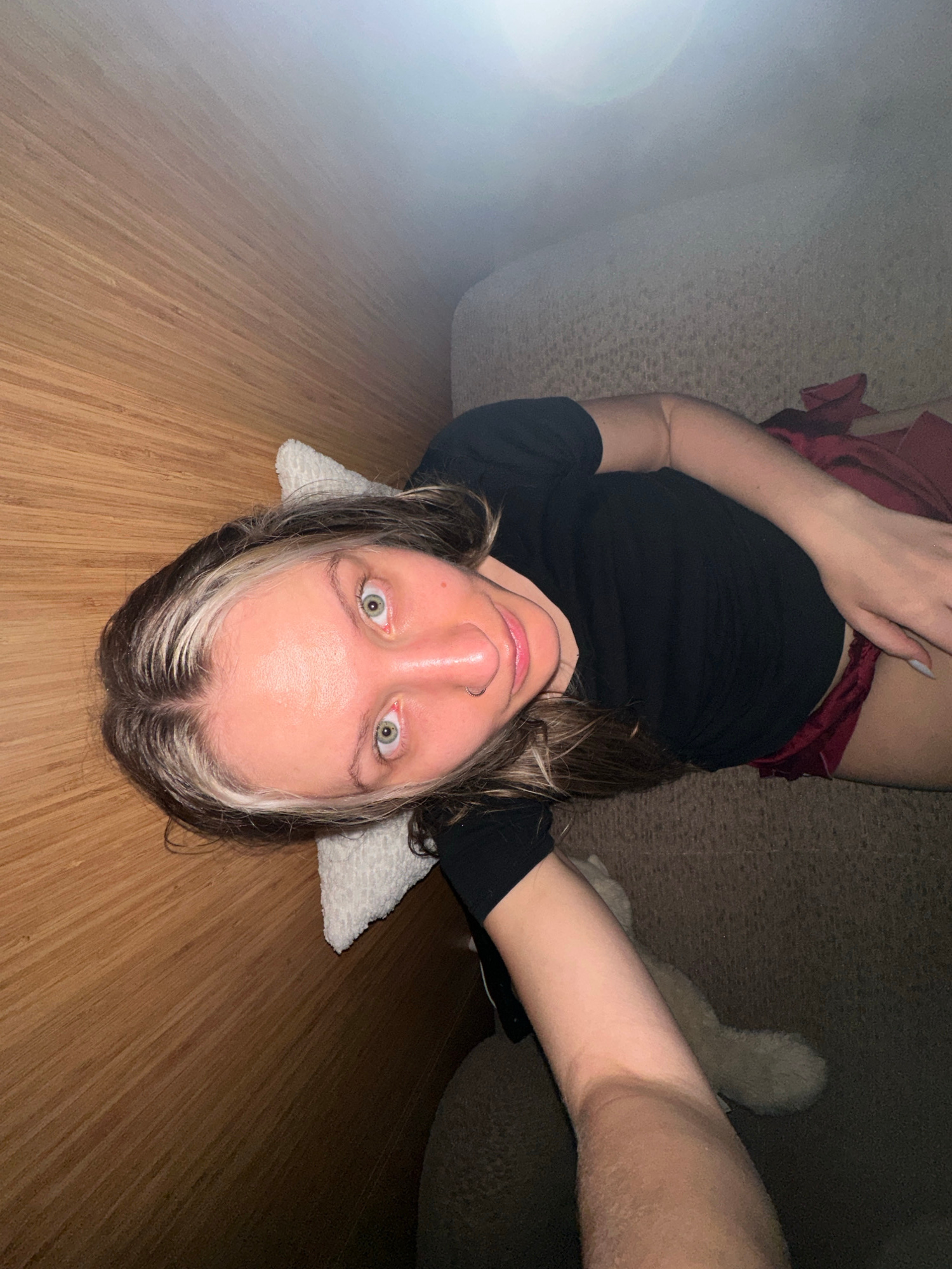 A person with shoulder-length brown hair with a wide white streak is lying on their back on a white cushion on a wooden floor. The person is wearing a black t-shirt and what appears to be red shorts o…read more