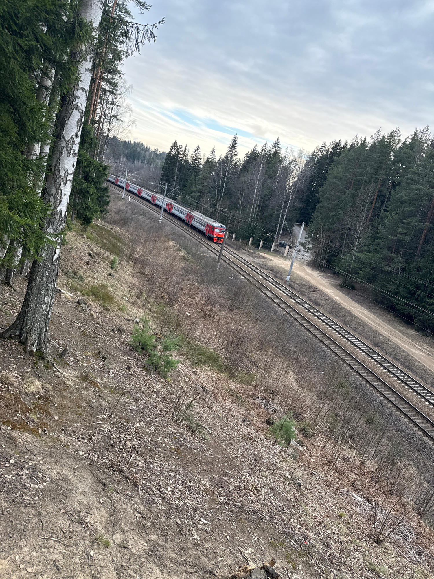 The image depicts a train moving along a railway track in what appears to be a wooded area. The train is red and white, and the tracks run through a landscape consisting of trees and foliage. The sky…read more