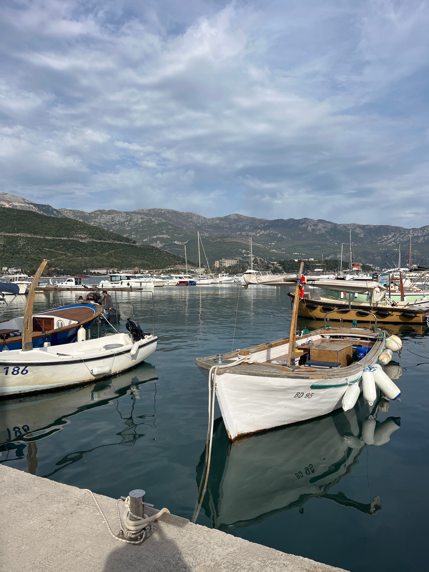 The image shows a marina in Budva, Montenegro. Several boats are docked along a concrete pier. In the foreground, there are two white boats. One boat has the registration number "BD 95" and is equippe…read more