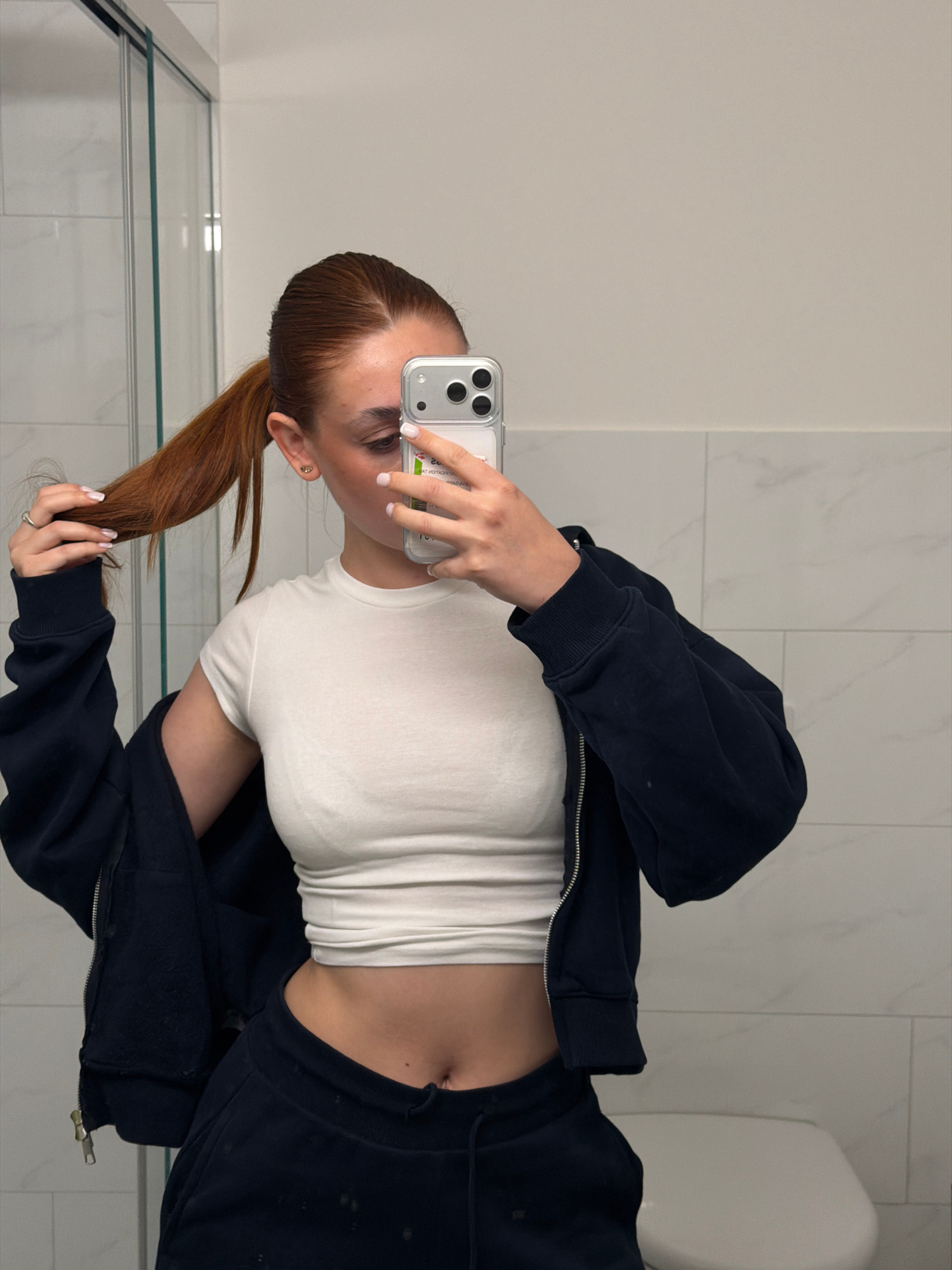 A woman is taking a selfie in a bathroom. She is wearing a white crop top and a black zip-up hoodie, and black sweatpants. Her hair is pulled back in a ponytail. The background shows white tiled walls…read more