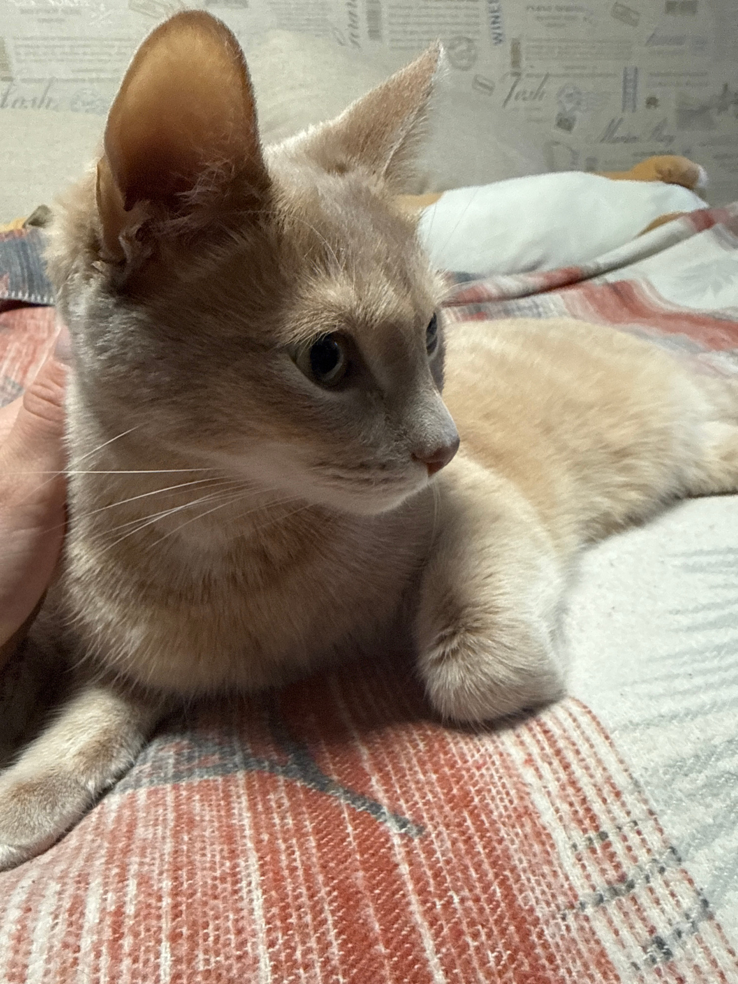 A beige cat lies on a patterned blanket, seemingly indoors. The location is Chaikovsky, Russia, based on contextual information not visually present in the image.