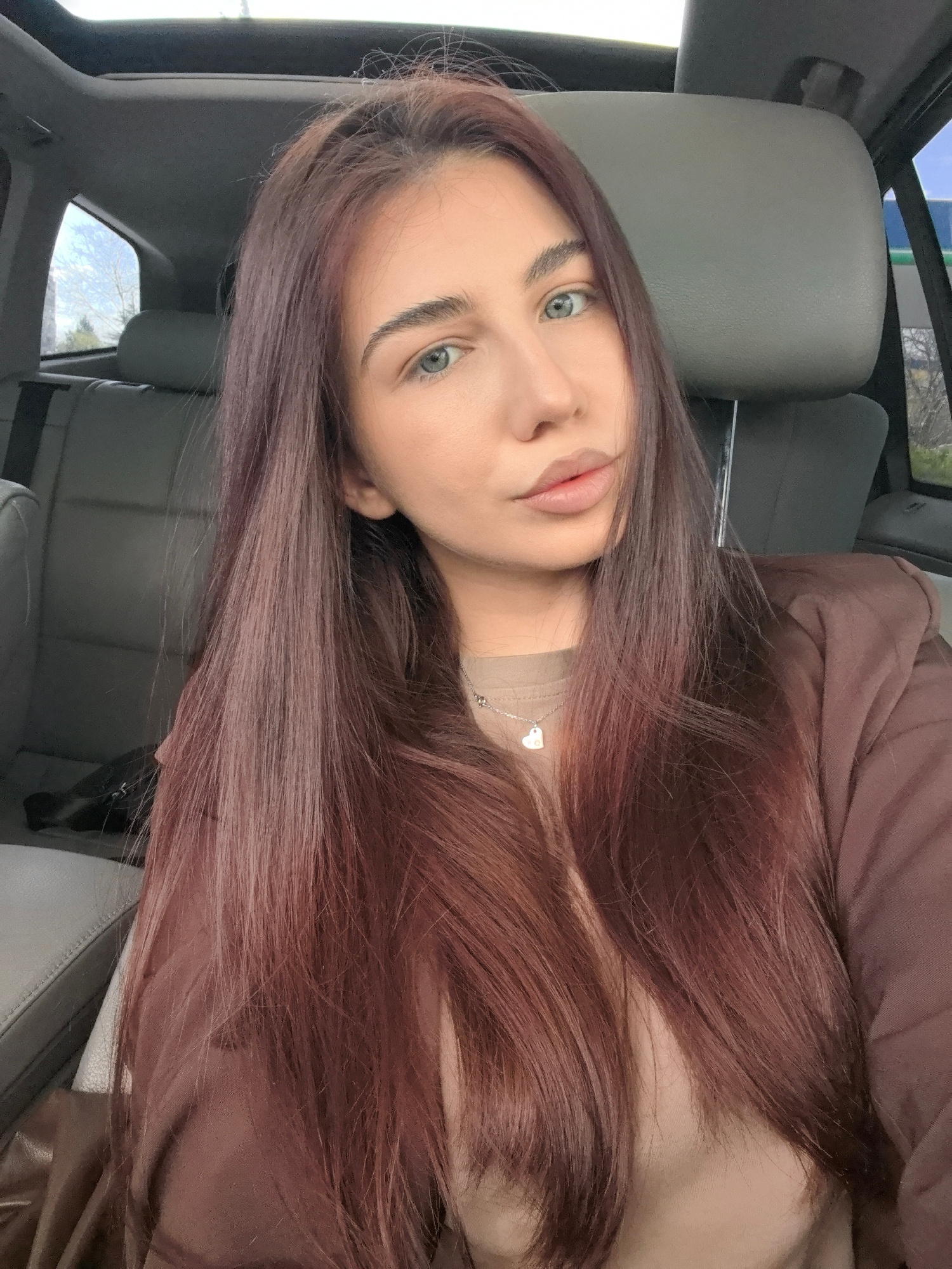 A young woman sits in the driver's seat of a car. She has long, straight auburn hair, fair skin, and blue eyes. She is wearing a brown top and a silver necklace with a heart pendant. The car's interio…read more