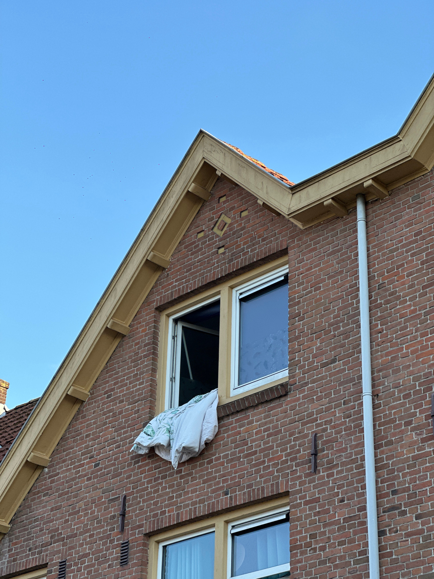The image shows a low-angle view of a brick building in Amsterdam, Netherlands, possibly a residential structure. The building has a light-colored trim and a visible gutter running along the brick fac…read more