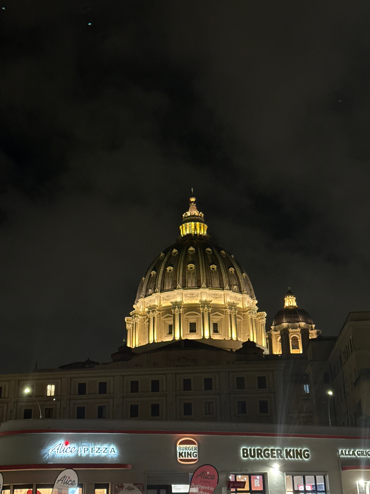 The image presents a nighttime urban scene in Rome, Italy, capturing the illuminated dome of St. Peter's Basilica. The large central dome, featuring multiple tiers, columns, and a lantern, glows withβ¦read more