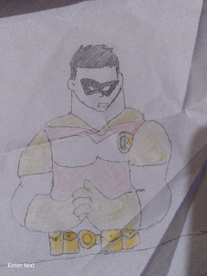 A hand-drawn image depicts a superhero-like figure on a white, possibly crumpled piece of paper. The figure is wearing a mask over his eyes, and his hair is short and dark. He is depicted with a muscu…read more