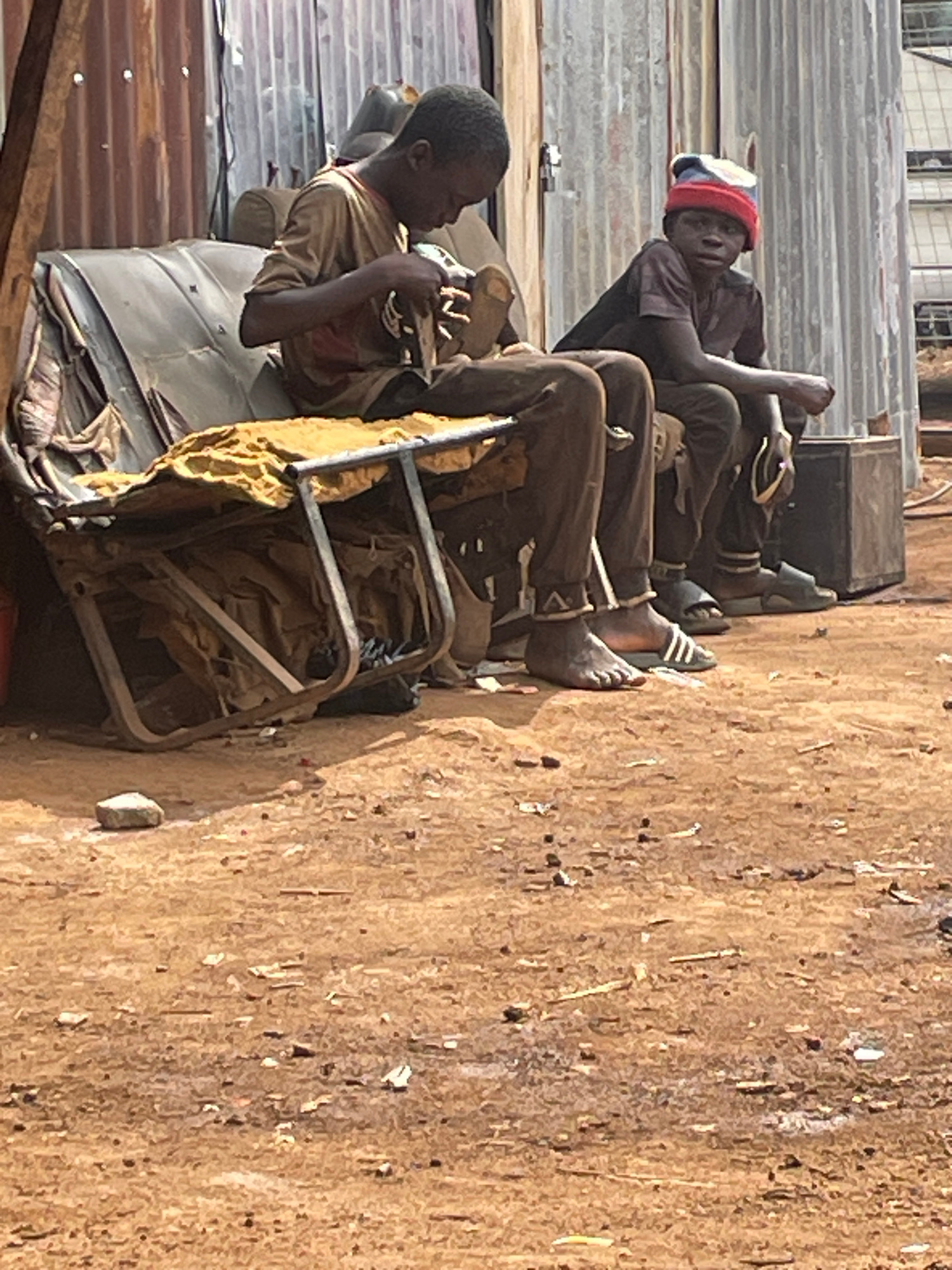 The image shows two young males sitting in makeshift chairs constructed from scrap metal and fabric in Jos, Nigeria. The environment appears to be a poverty-stricken area with corrugated metal roofingβ¦read more