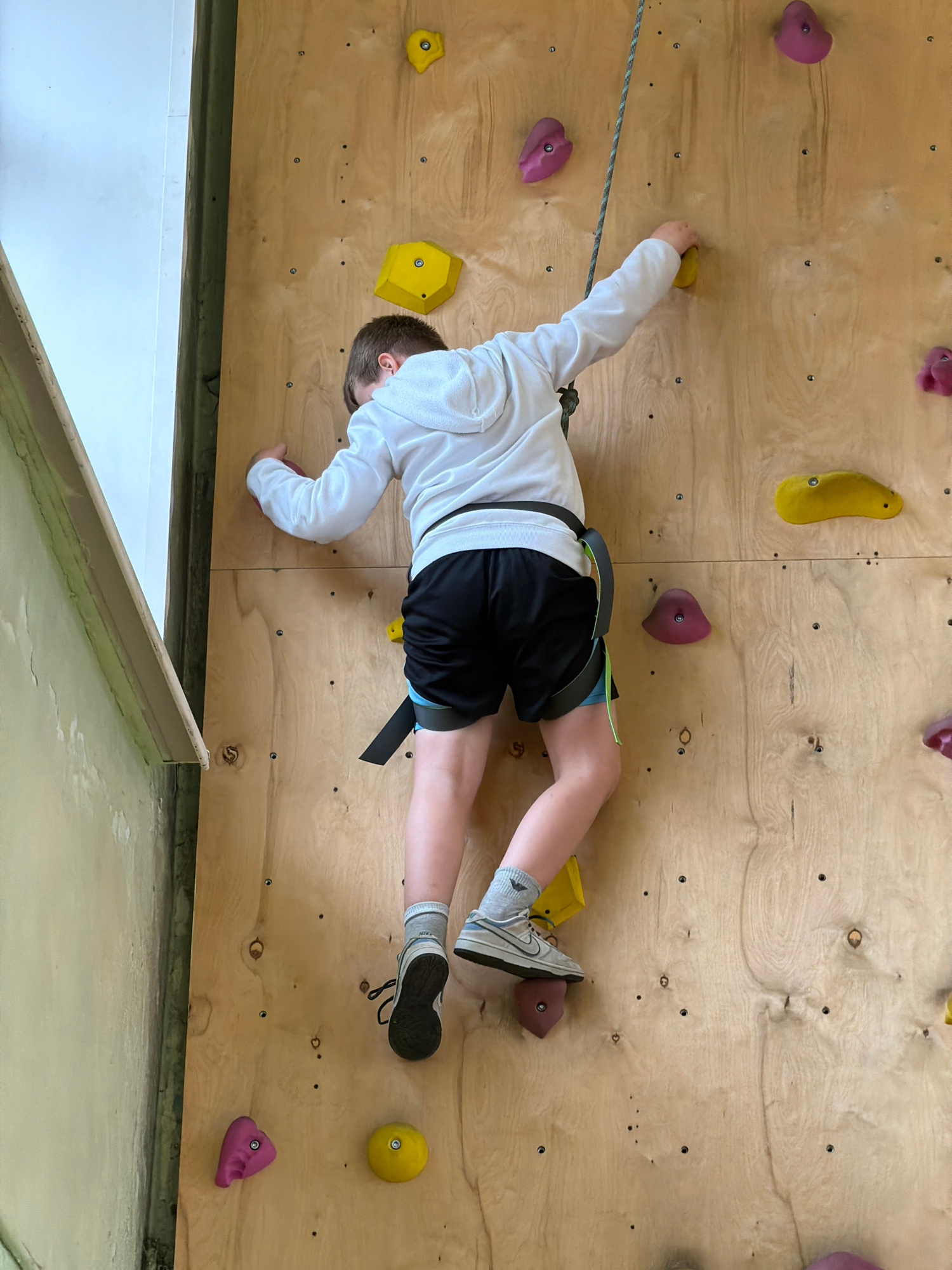 The image captures a child or young person actively engaged in indoor rock climbing on a wooden climbing wall. The individual is seen from a top-down perspective, positioned horizontally across the wa…read more