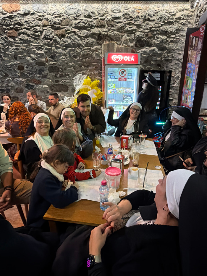 A group of people, some dressed as nuns and a police officer, are seated around a table. The table is cluttered with cups, bottles, and other items. A child is being held by a person wearing a dark co…read more