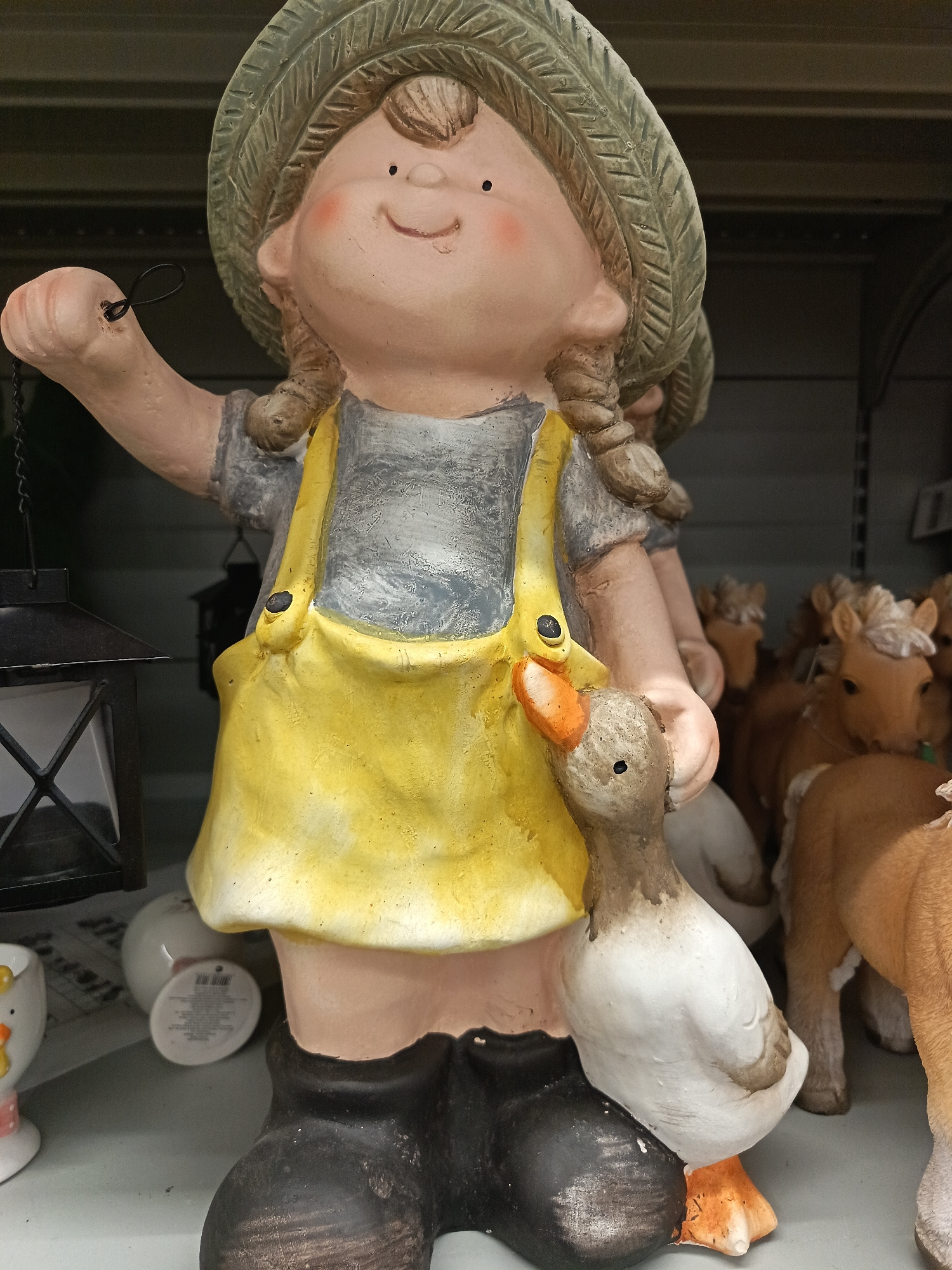 A ceramic figurine of a girl in a straw hat and yellow overalls is standing on a shelf, holding a lantern in her left hand and a duck in her right. The girl has rosy cheeks and braided pigtails. Behin…read more