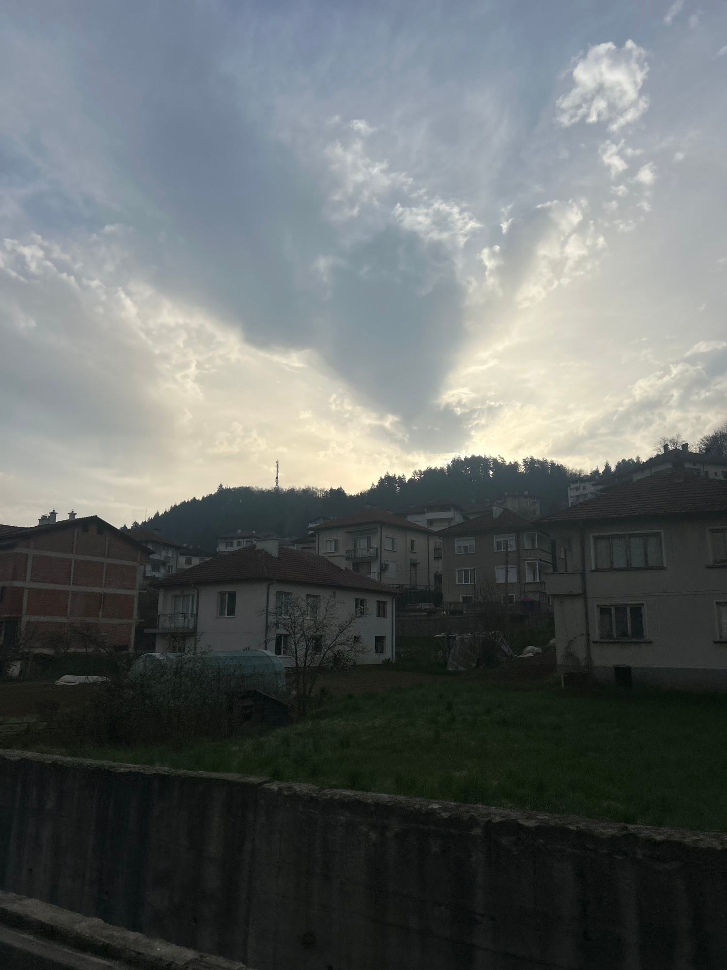 The image shows a view in Zlatograd, Bulgaria, looking towards a hillside with houses built along its slope. The sky is filled with clouds, and the sun appears to be behind them, creating a soft, diff…read more