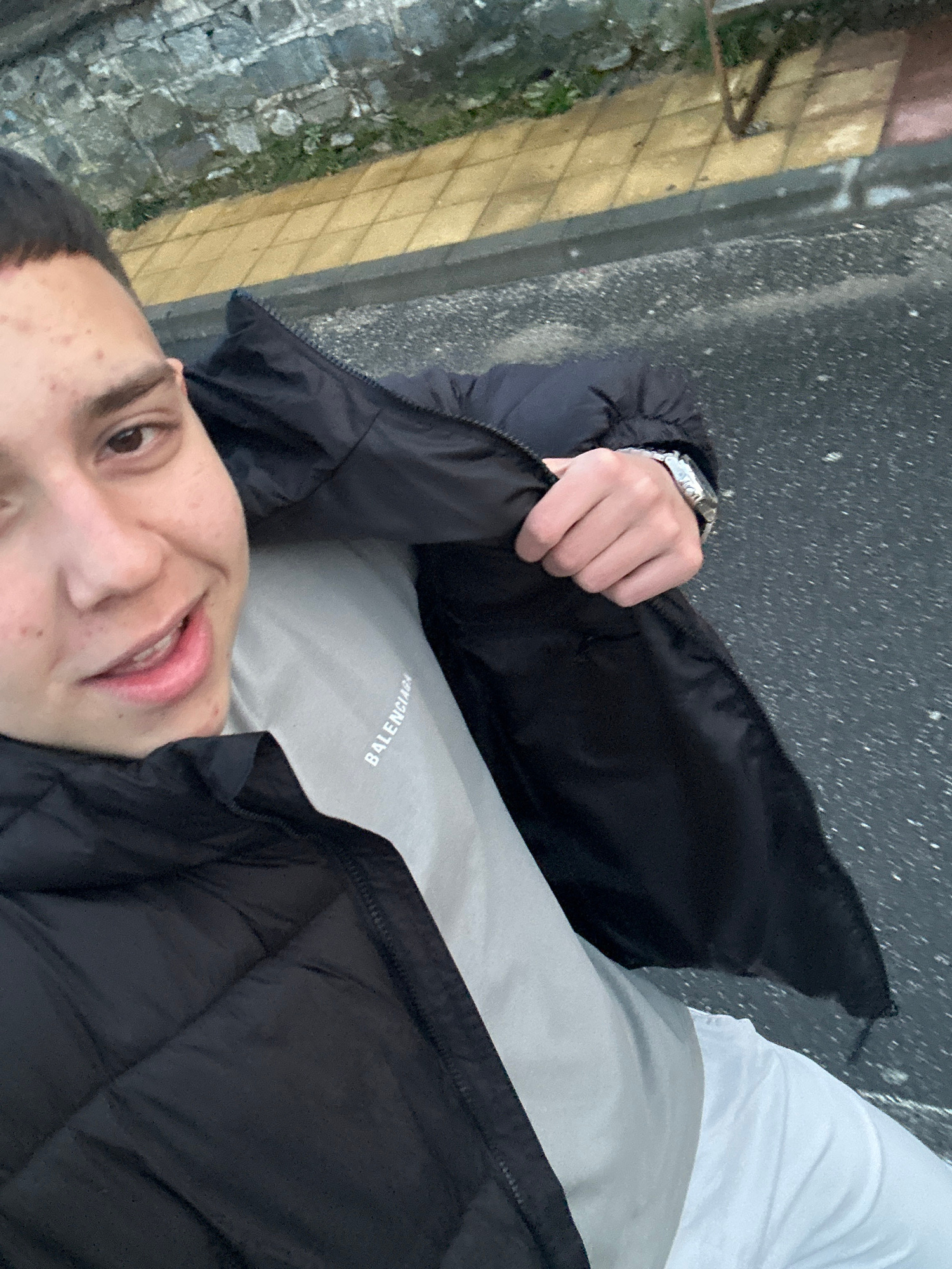 The image depicts a person lying on their back outdoors, partially on a sidewalk. The location appears to be Zlatograd, Bulgaria based on the paving stones. The person is wearing a black quilted puffe…read more
