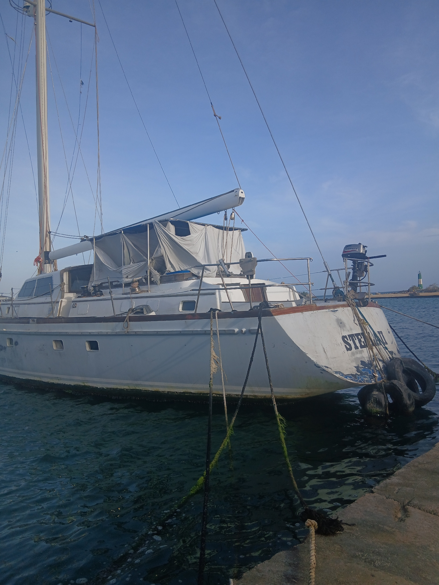 The image shows a white boat named "STELLA" docked at a pier in what appears to be Porlamar, Venezuela. The boat is secured with ropes, some covered with green algae, suggesting the water is brackish.…read more