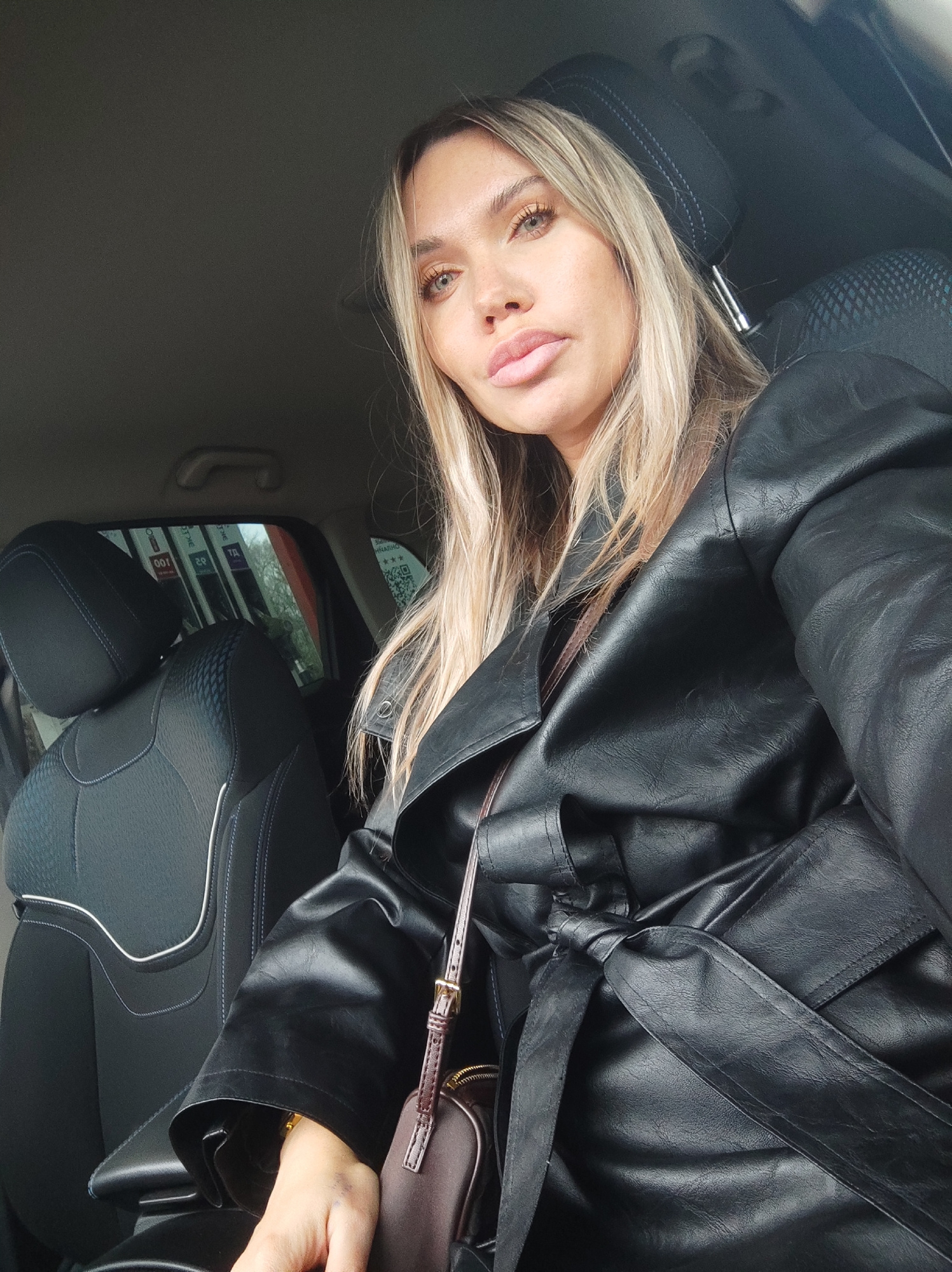 A fair-skinned woman with blonde hair sits in the driver's seat of a car. She wears a black leather jacket tied at the waist, and a brown purse is visible. Through the car window, one can see gas pump…read more