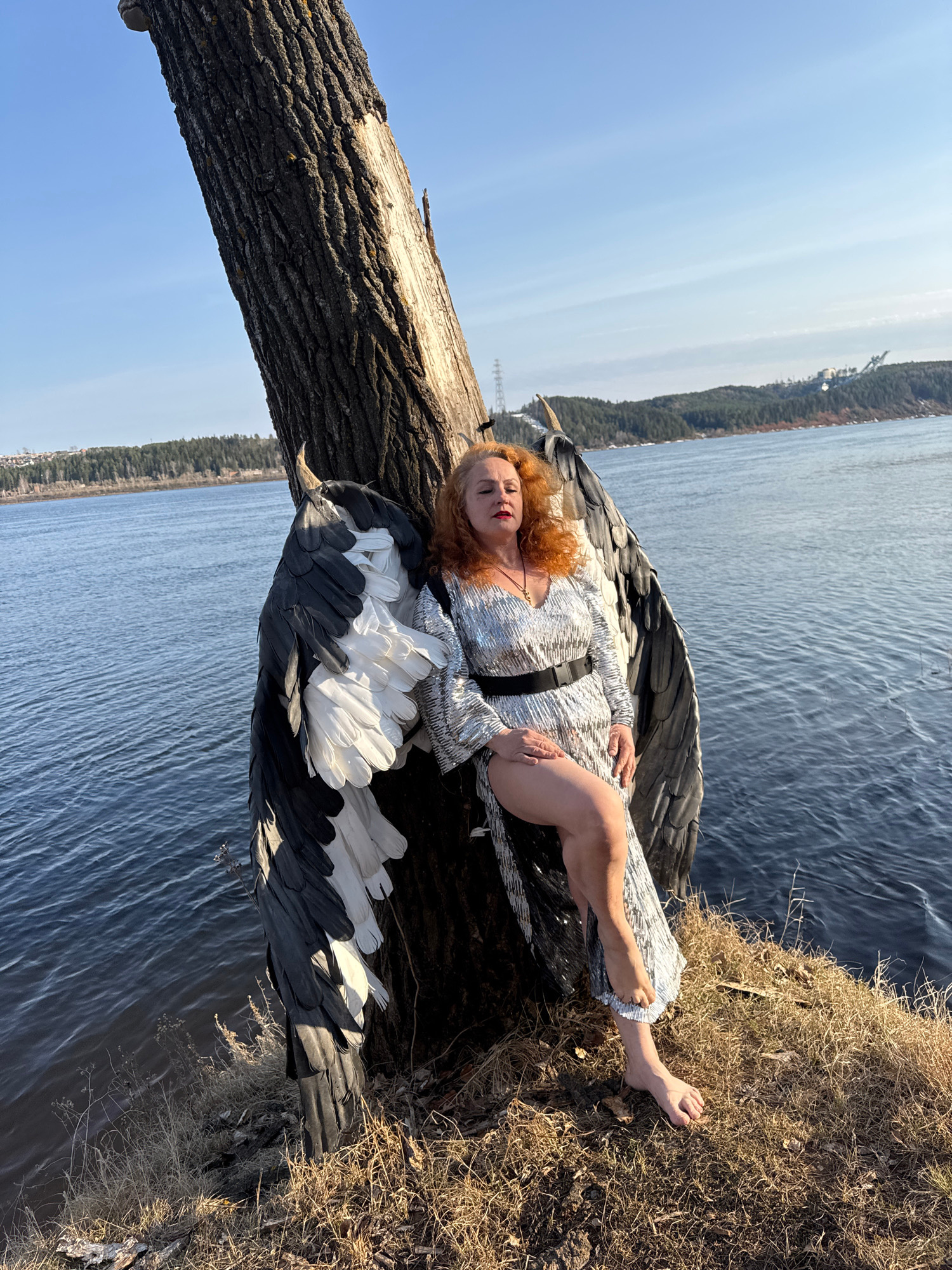A female figure lies on a fallen tree trunk at the water's edge. She has red hair and wears a silver dress with a black belt. Large black and white feathered wings are positioned around her. The locat…read more