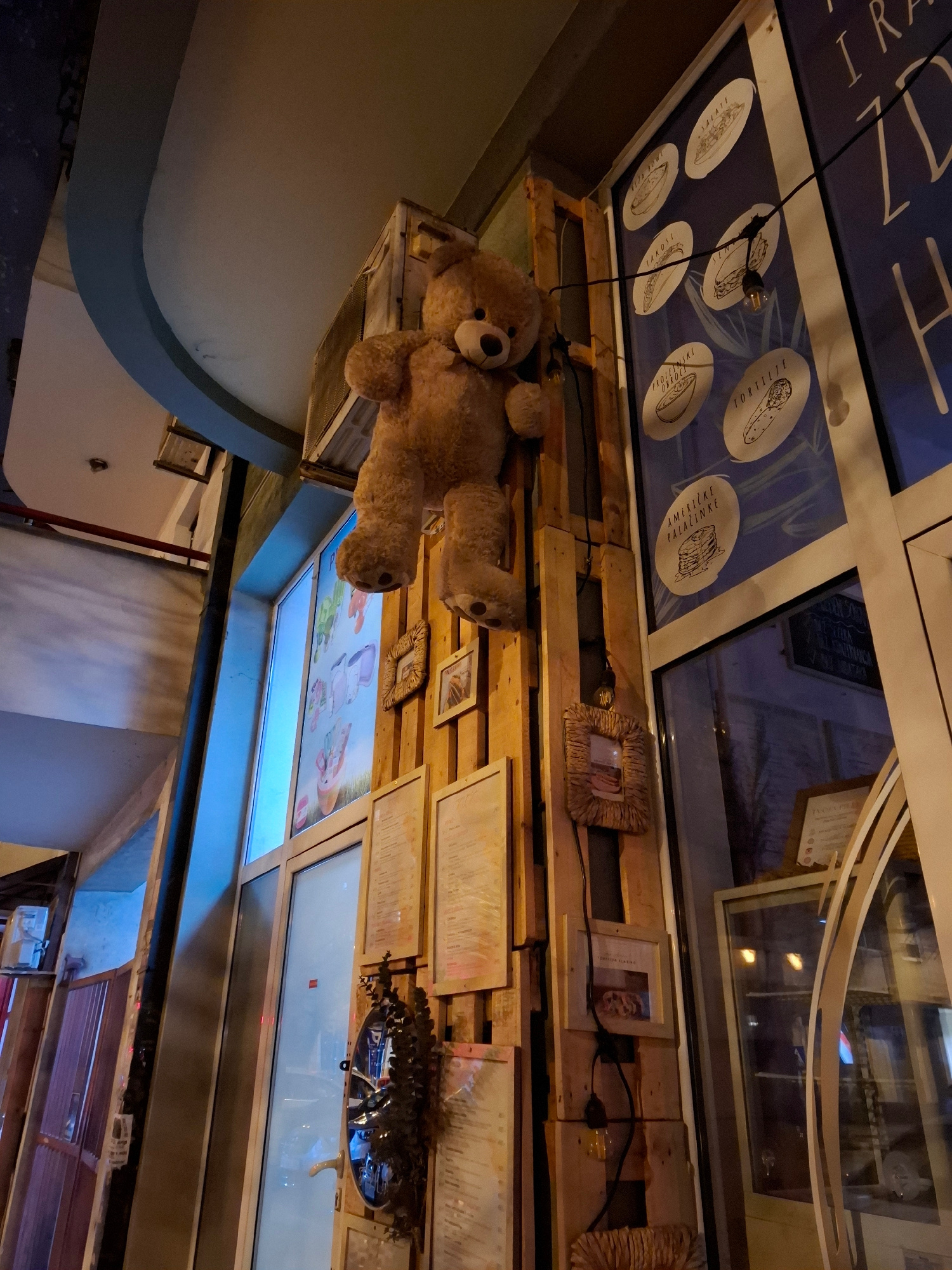 A teddy bear hangs from the ceiling of a restaurant in Novi Sad, Serbia. The ceiling is decorated with wooden pallets, framed pictures, and menus. Some windows are decorated with pictures of food. The…read more