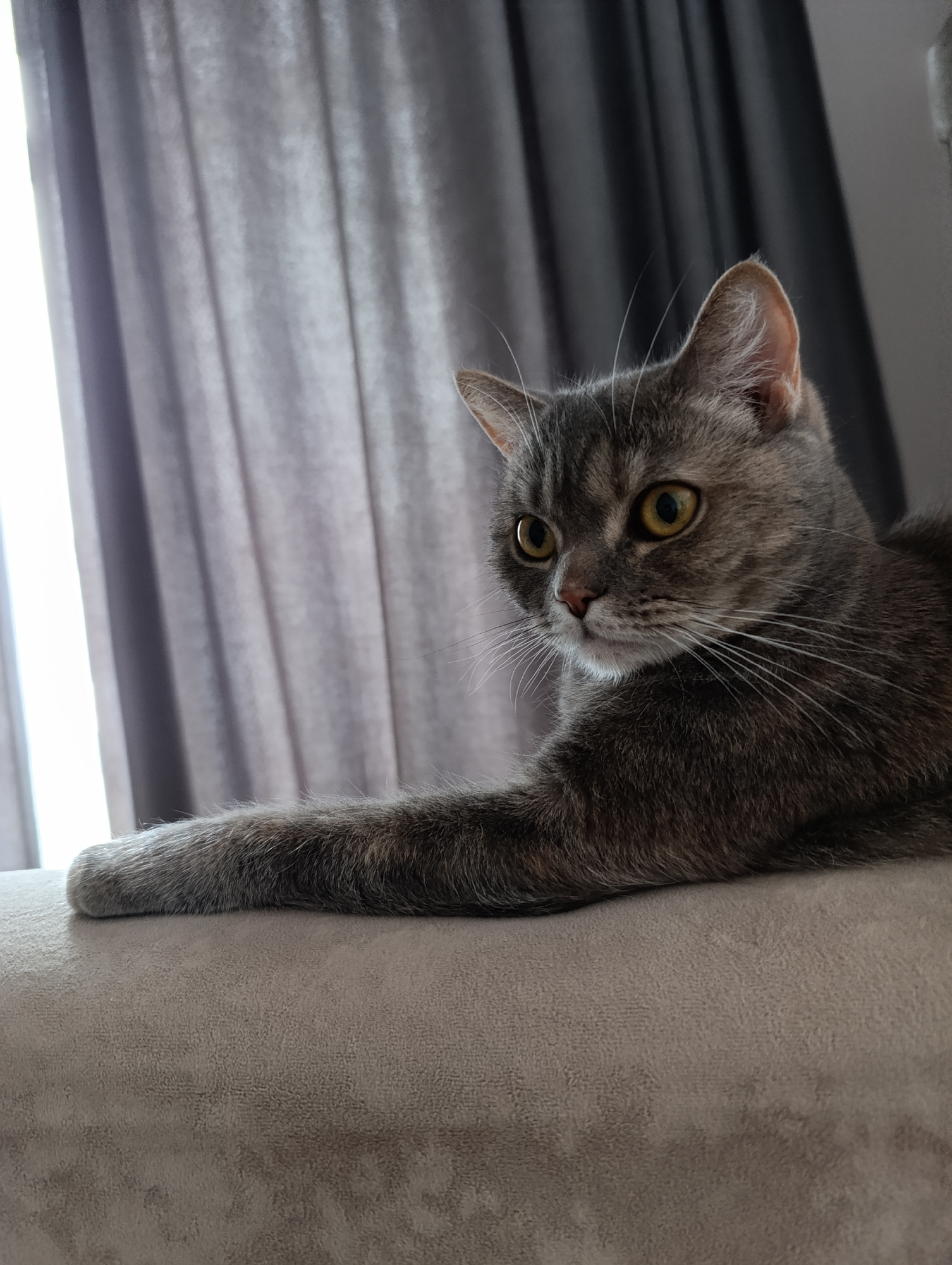 A gray tabby cat with yellow eyes is lying on a gray couch. The cat's left front leg is extended along the couch's surface. Gray curtains are visible in the background. There is no discernible informa…read more