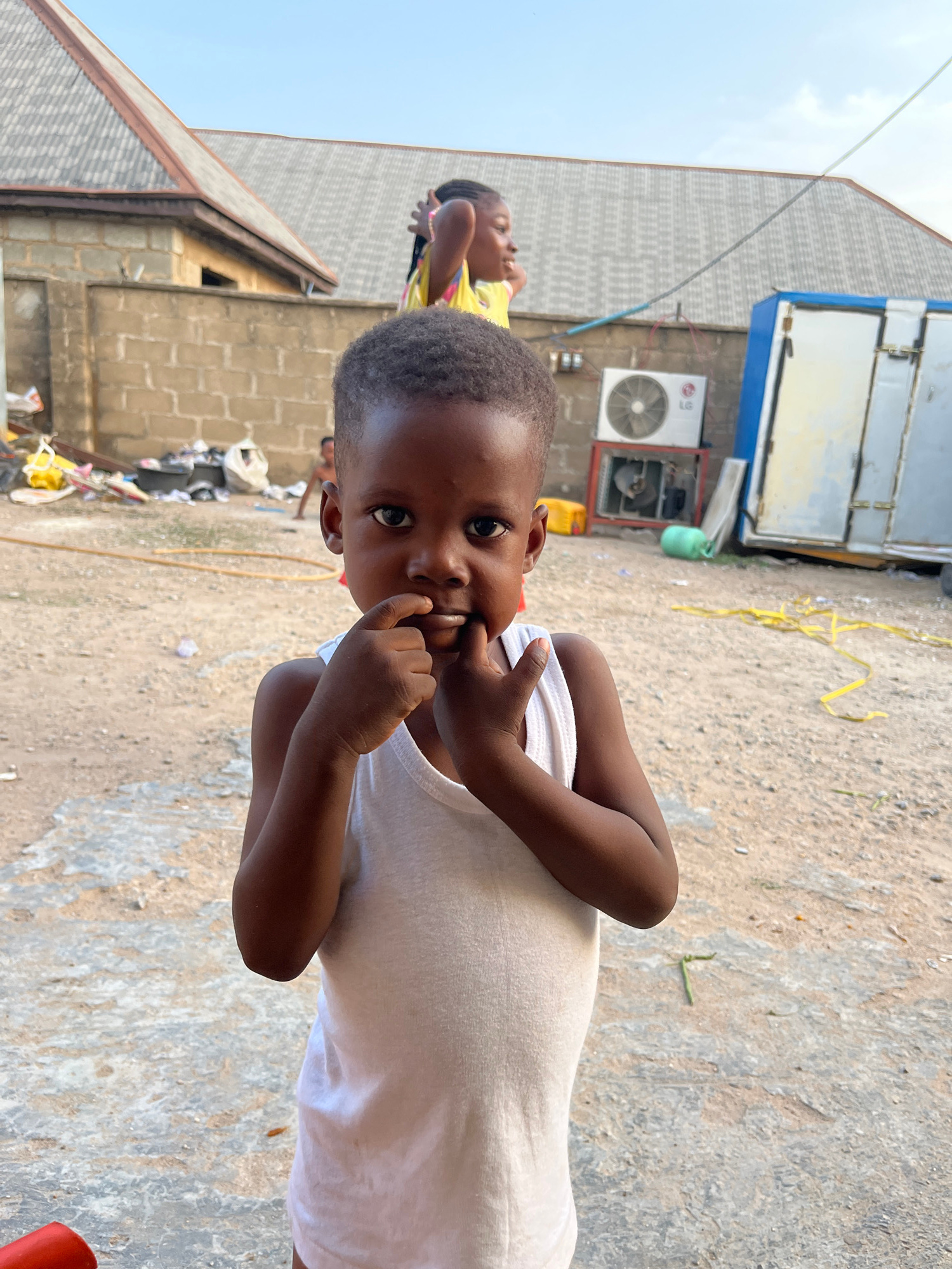 A young, dark-skinned child with close-cropped hair stands in a yard. They are wearing a white sleeveless shirt and have their fingers touching their face. In the background, there are buildings const…read more
