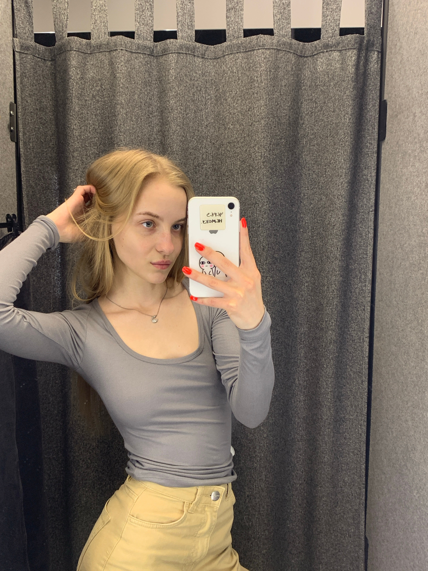 A blonde woman is taking a selfie with her phone in what appears to be a dressing room. She is wearing a grey long-sleeved shirt and tan pants. The dressing room has a grey fabric background and white…read more