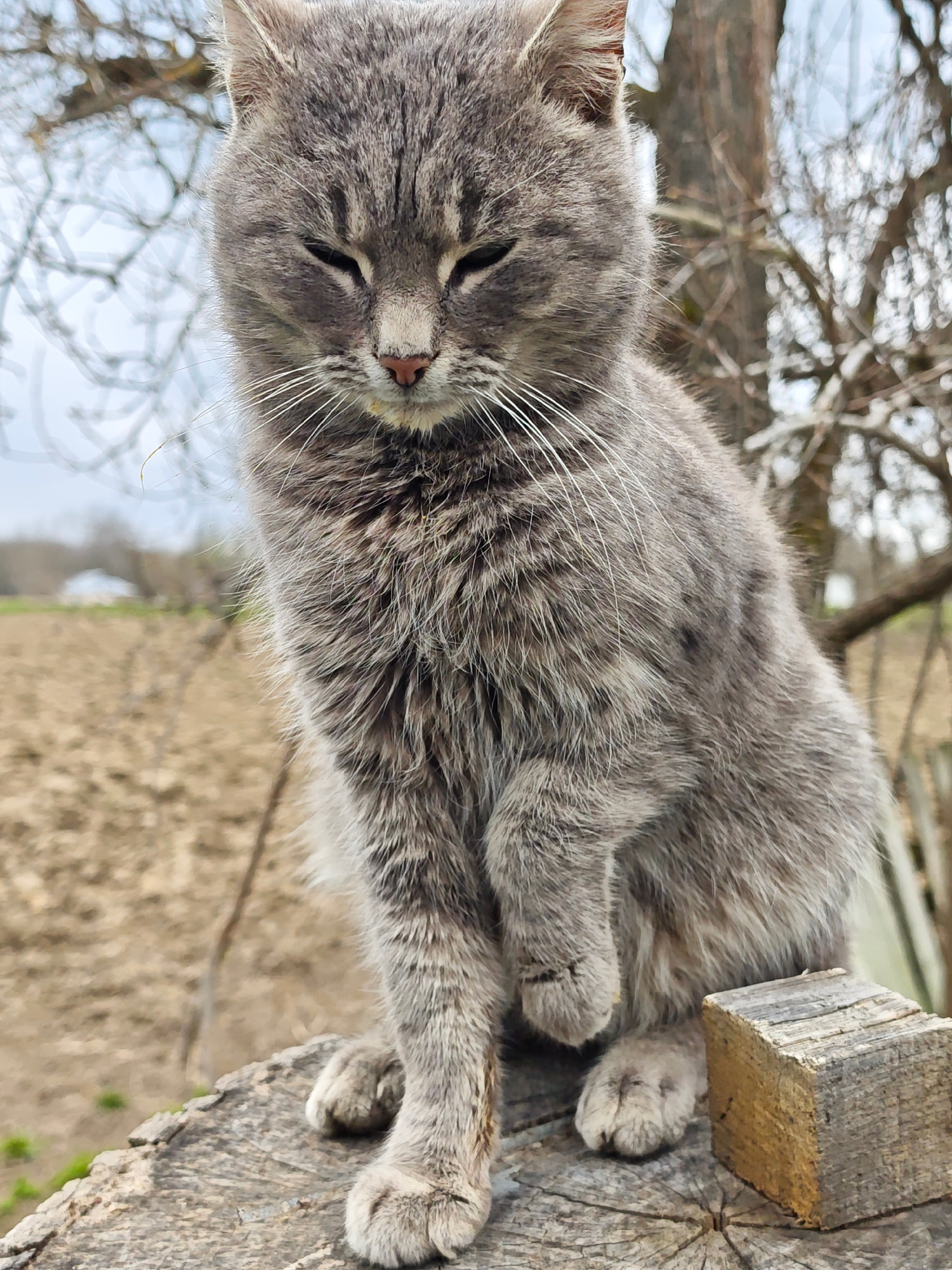A grey cat is sitting on a weathered wooden stump outdoors. The cat has grey fur, a pink nose, and white whiskers. Its eyes are mostly closed. The cat is positioned in front of a bare tree with a till…read more