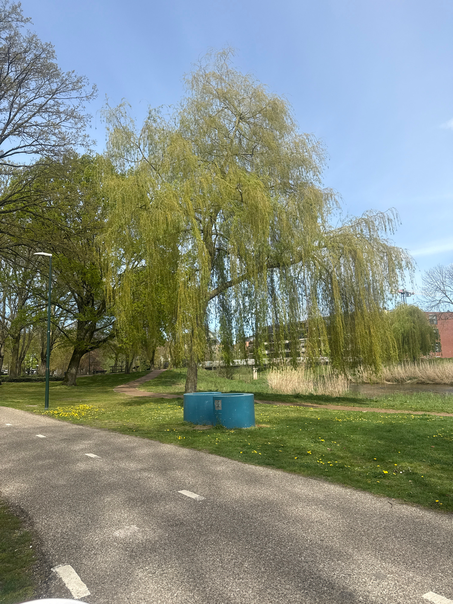 The image presents a scene in Veghel, Netherlands. A paved path, marked with white stripes, runs along the right side of the frame. To the left of the path is a grassy area dotted with yellow flowers.…read more