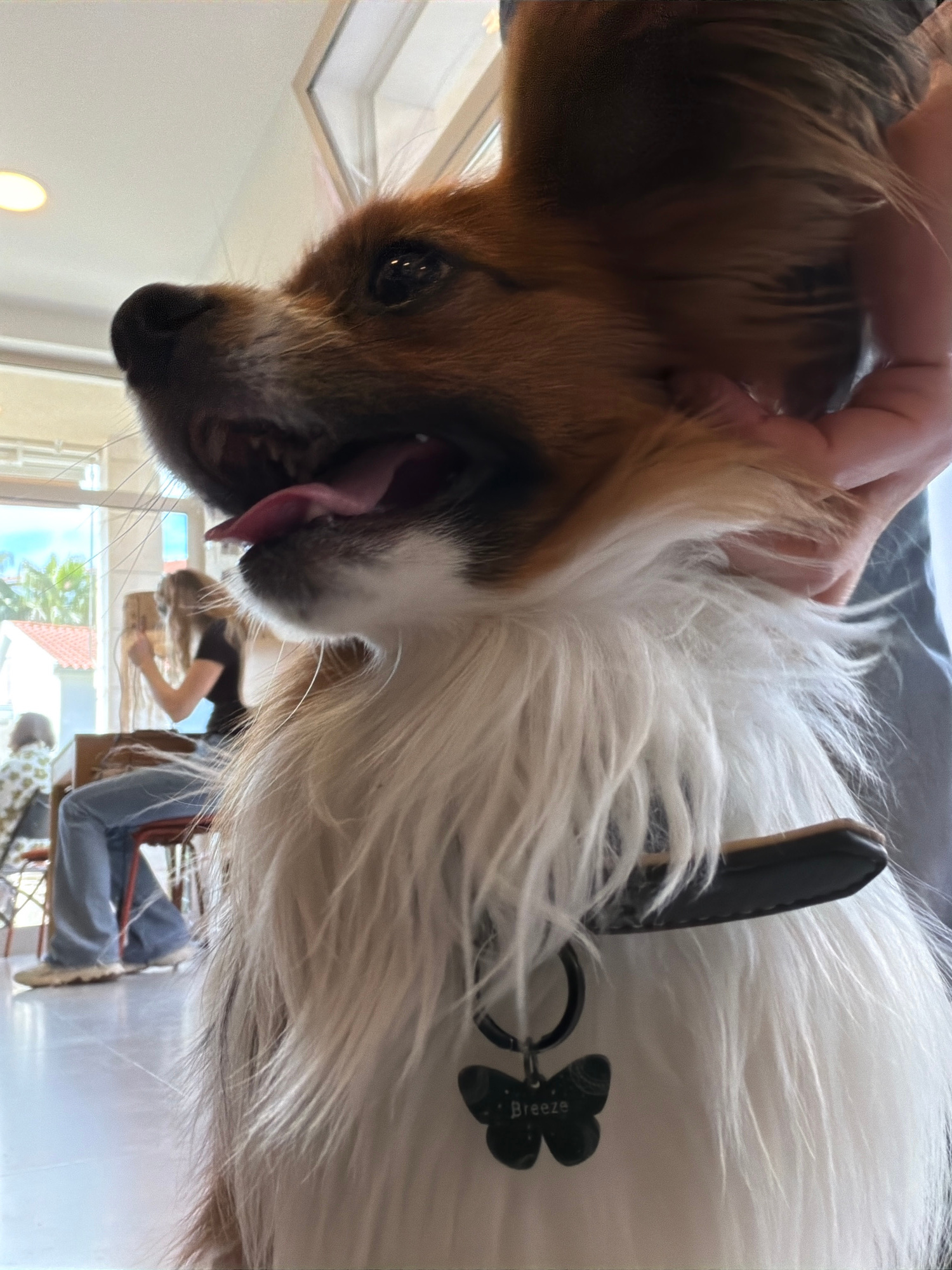A medium shot of a dog being held upside down indoors. The dog is brown and white with a long coat of fur and a black collar with a tag shaped like a four-leaf clover. The dog's mouth is open with its…read more