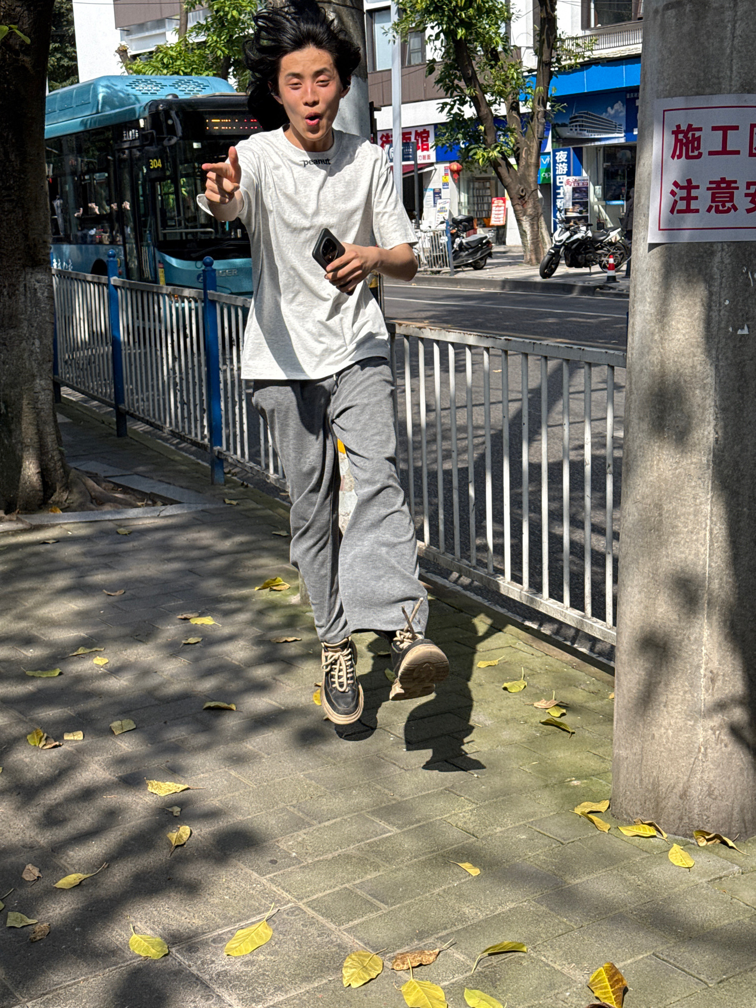 A young man of East Asian descent stands casually on a sunlit sidewalk in an urban setting, likely Nan'an District, China. He is dressed in a light grey or white t-shirt with "peanut" written in small…read more
