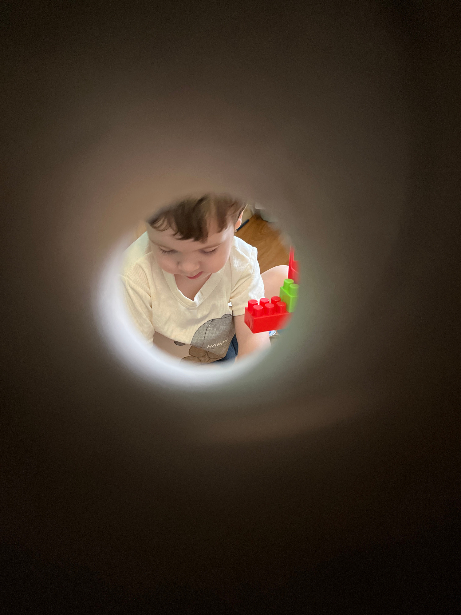 A child is seen through a circular opening, likely a tube or pipe, wearing a light-colored long-sleeved shirt with a bear design on the shoulder, playing with red and green building blocks. The backgr…read more