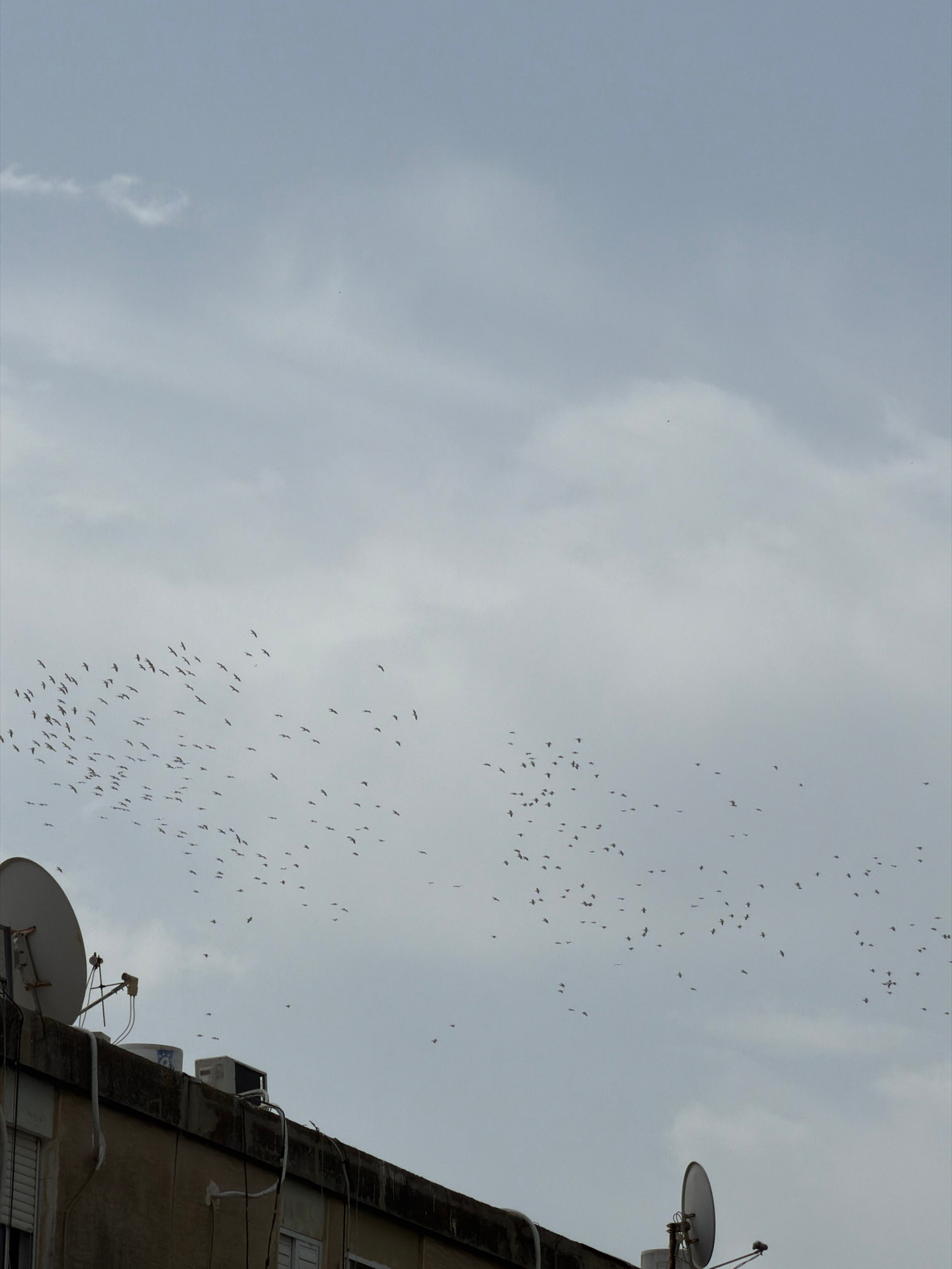 An upward-angled photograph captures an overcast sky filled with a large flock of birds, alongside the right side of a building in Kiryat Bialik, Israel. The sky is a uniform light grey, indicating cl…read more