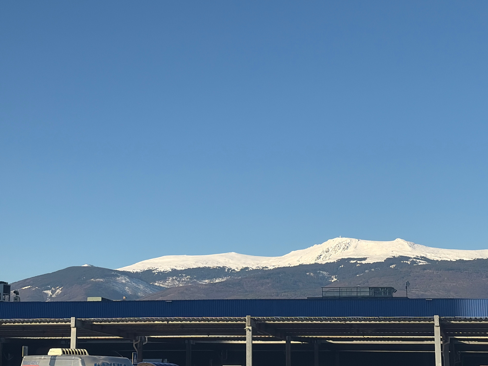 The image shows a view of Vitosha Mountain, identifiable by its distinctive silhouette and the presence of snow cover, seen from an urban location in Sofia, Bulgaria. The foreground is dominated by a…read more
