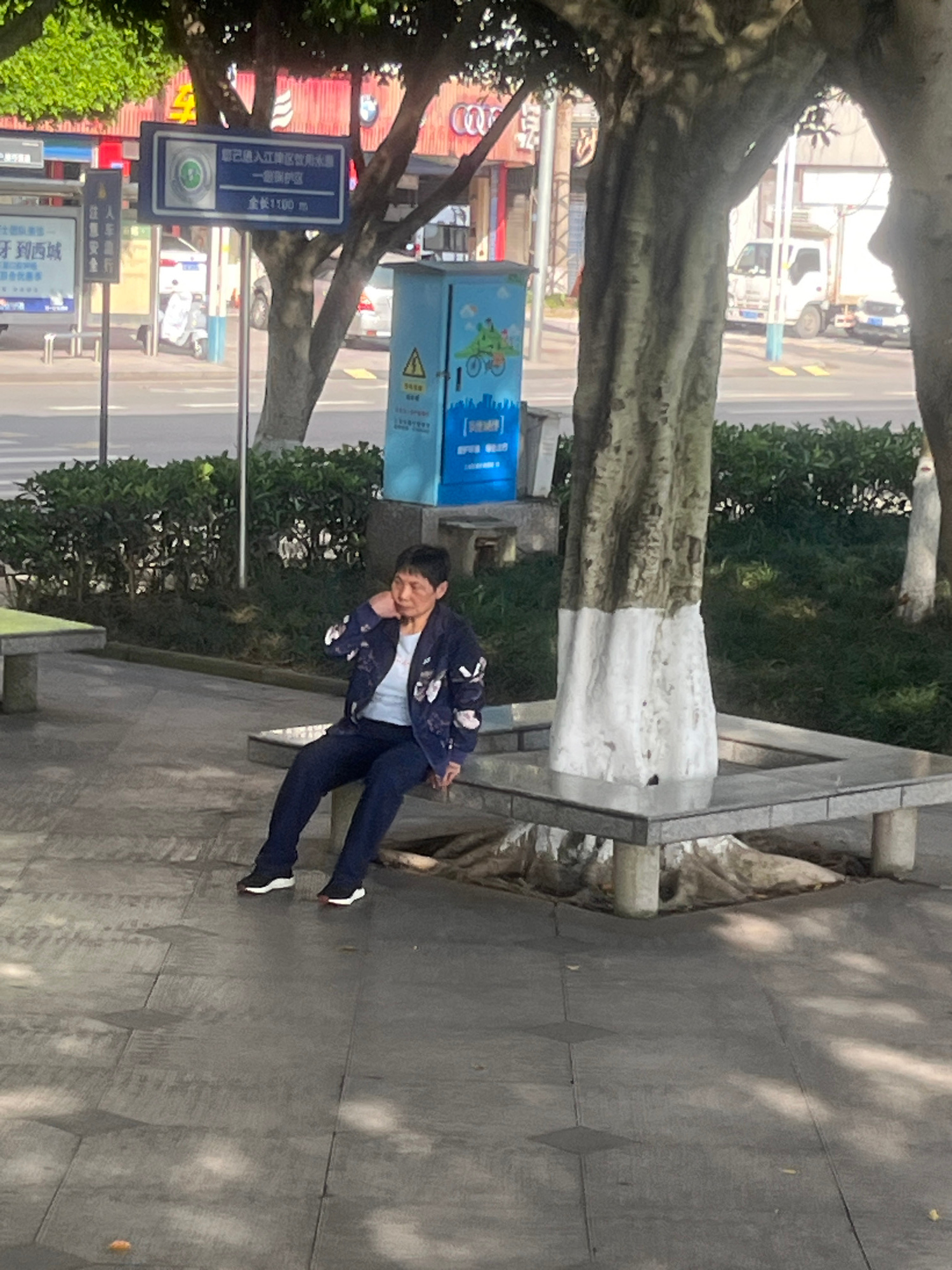 The image displays a daytime scene on a paved sidewalk, likely in an urban or suburban area of Jiangjin, China, given the visible text. A person, appearing to be male, stands casually in the foregroun…read more