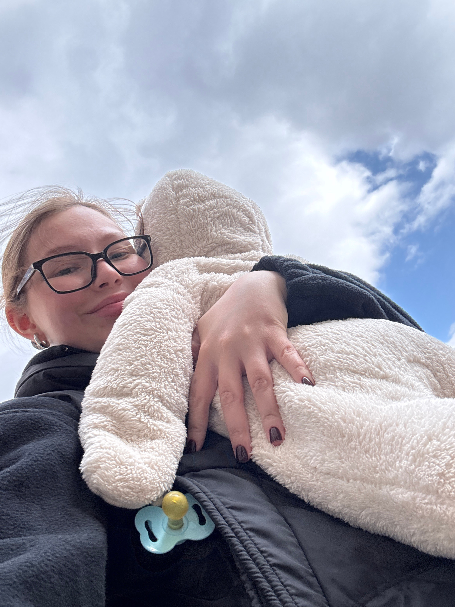 An upward-angle shot captures a person, likely an adult female, holding what appears to be a baby or small child wrapped in a fluffy, light-colored garment or blanket. The adult's head is inverted in…read more