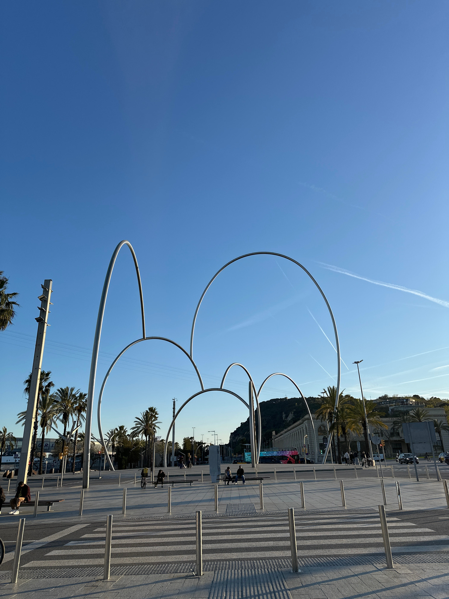 The image captures a street scene in Barcelona, Spain, featuring distinctive circular metal sculptures along the promenade. The sculptures, arranged in an overlapping sequence, stand out against the c…read more