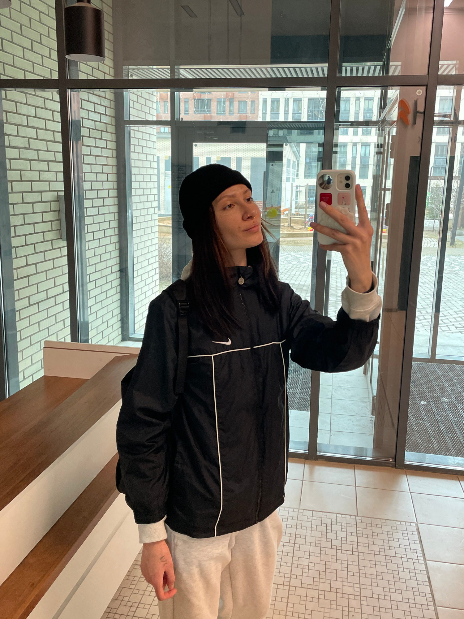 A woman is taking a selfie in what appears to be the entrance area of a building. She is wearing a black jacket with a white Nike logo, light-colored sweatpants, and a black beanie. She is holding a w…read more