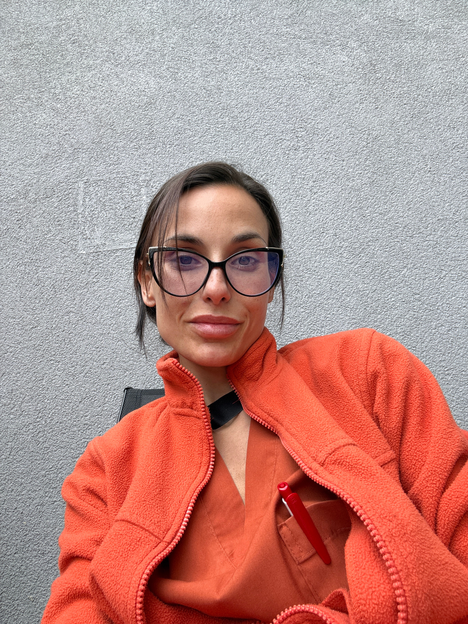 A woman with dark hair pulled back and wearing glasses is the primary subject of the image. She is wearing an orange fleece jacket, partially unzipped, revealing a matching orange shirt underneath. A…read more
