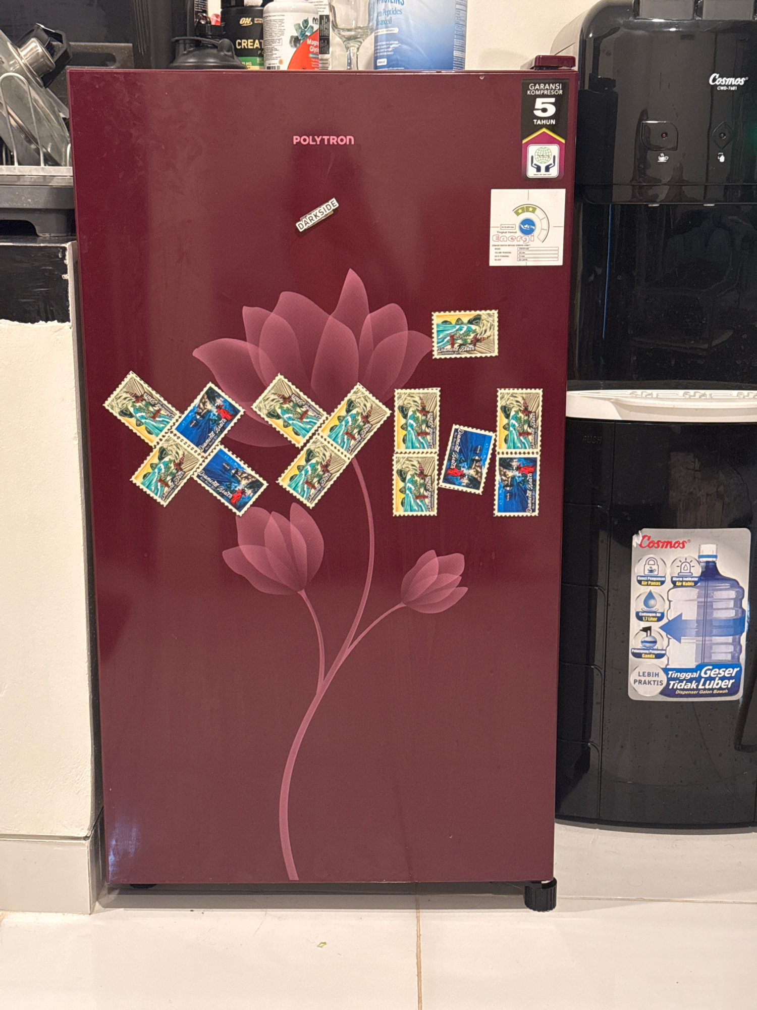 The image shows a maroon-colored refrigerator adorned with various stamps, stickers, and decals. Notably, there's a floral design on the refrigerator's surface. The brand name "POLYTRON" is prominentl…read more