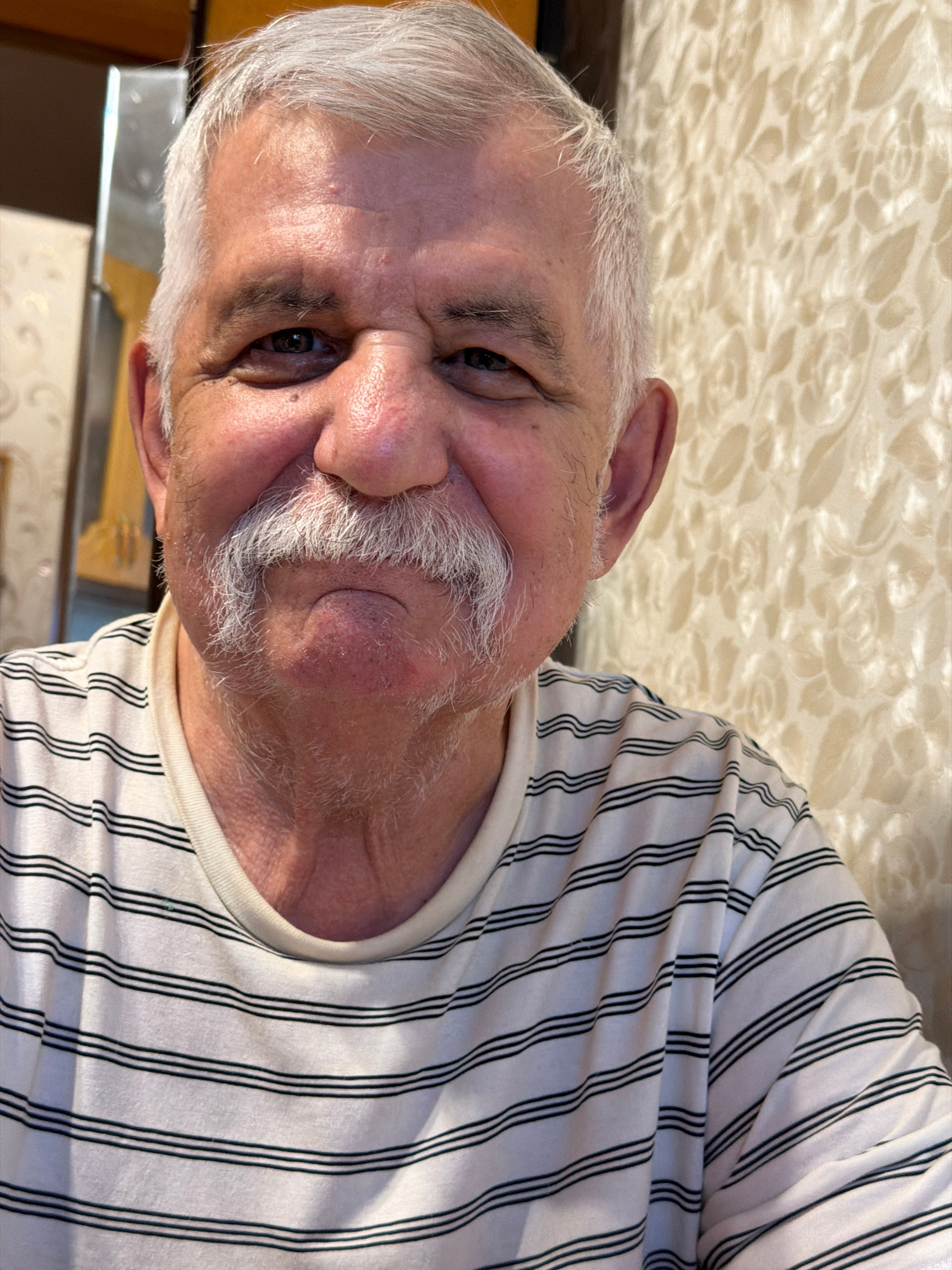 An older man with white hair and a white mustache is wearing a white and black striped shirt. The background is a beige and white textured surface. The photo is taken from a close-up, slightly angled…read more