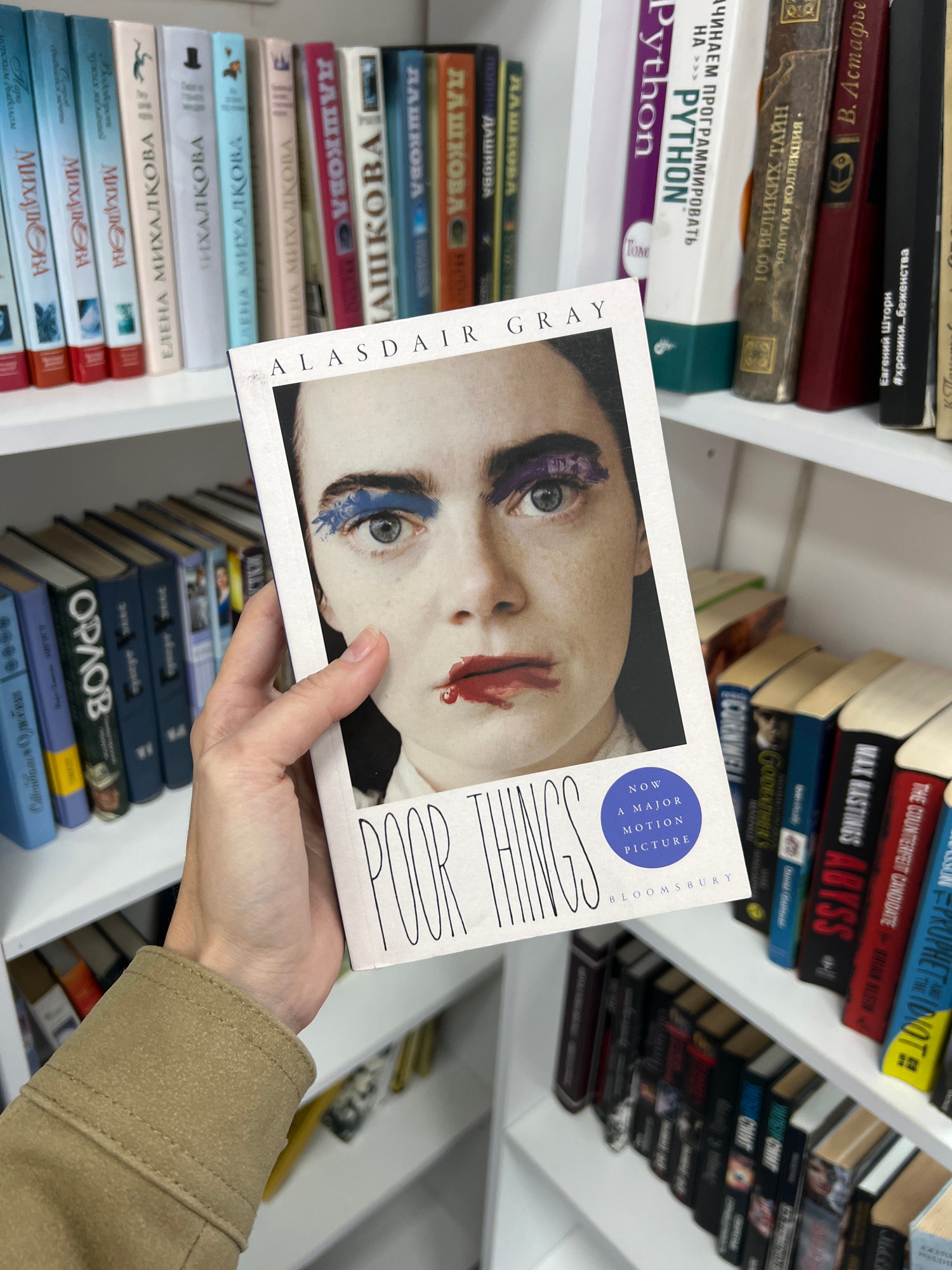 A person is holding a copy of the book "Poor Things" by Alasdair Gray in front of a bookshelf. The bookshelf is filled with books in Russian, English, and other languages. The setting appears to be a…read more
