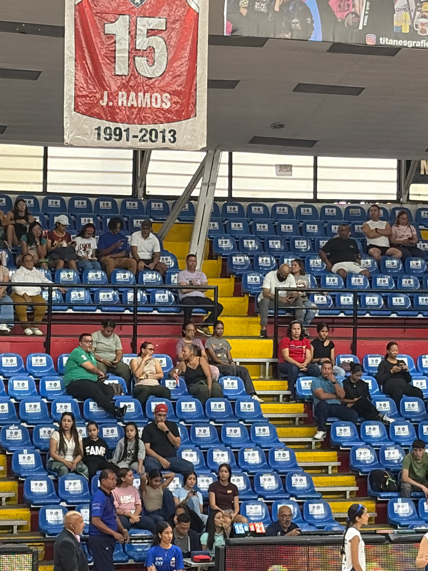 The image shows a partial view of an indoor stadium seating area with spectators occupying blue seats. There's a banner visible, red with white text: "15 J. RAMOS 1991-2013." Some spectators are sittiโฆread more