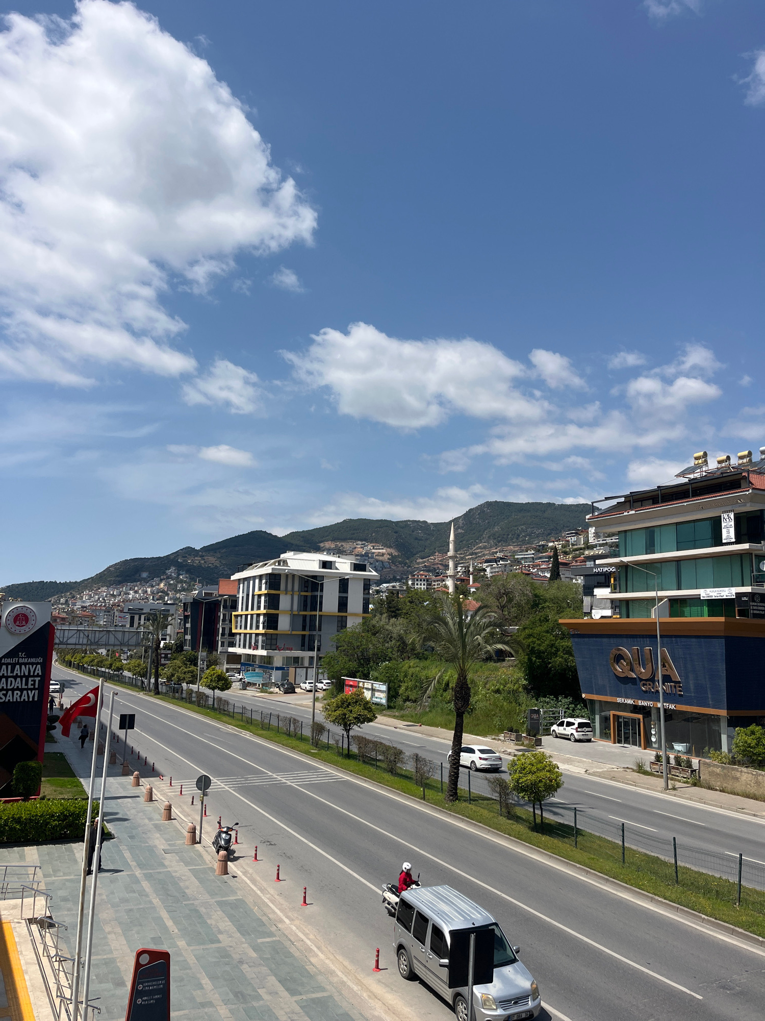 The image shows a view of a street in Alanya, Turkey, with a mountain range in the background. The sky is blue with scattered clouds. Along the right side of the image is a multi-lane road with a gras…read more