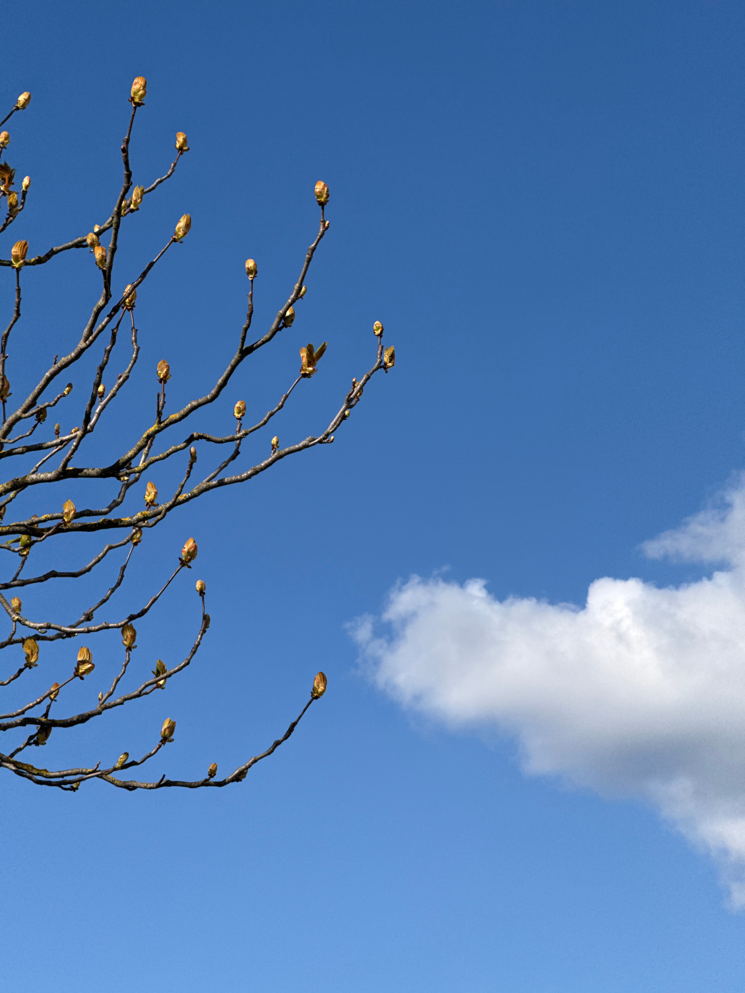 A low-angle shot depicts branches with buds against a bright blue sky with a single white cloud. The scene is devoid of people and actions. The branches, located in Esch-sur-Alzette, Luxembourg, exten…read more