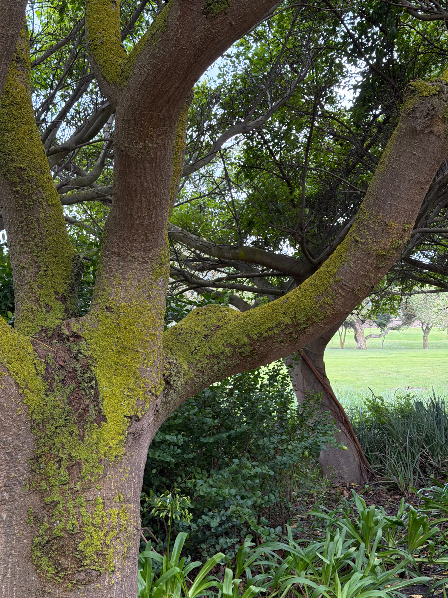 The image features a close-up view of a tree with thick, moss-covered branches. In the background, a grassy area can be seen with other trees in the distance. Additional foliage and plants surround th…read more