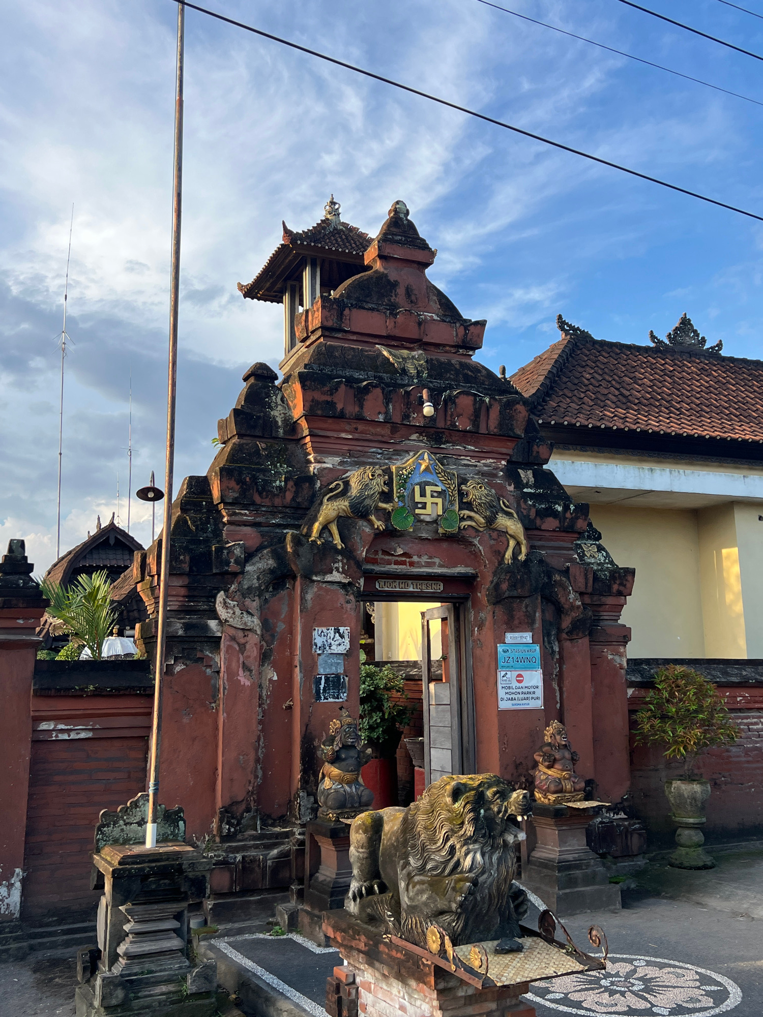 The image depicts an ornate entrance gate, likely to a building or complex, in Singapadu, Indonesia. The structure is predominantly red brick with intricate carvings, including golden lion-like figure…read more
