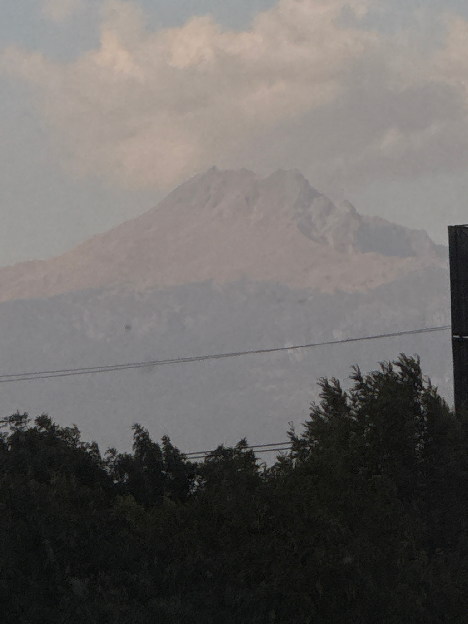 This image depicts the Popocatépetl volcano as viewed from San Andrés Cholula, Mexico. The volcano's jagged peak and upper slopes occupy the upper two-thirds of the frame, rendered in muted reddish-br…read more