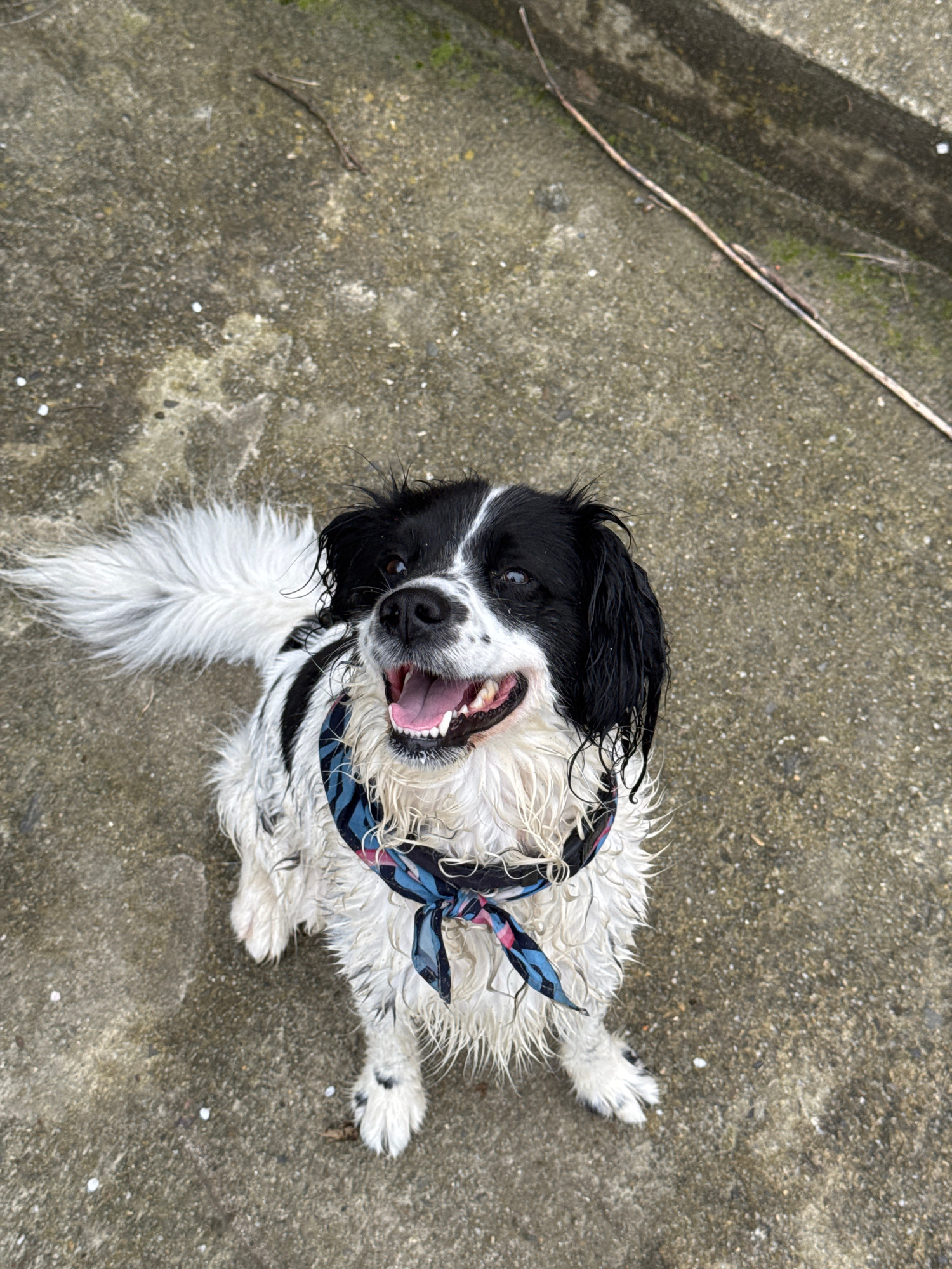 A wet, black and white dog with a blue and pink patterned bandana around its neck is lying on a concrete surface. The dog is facing the camera with its mouth open, seemingly smiling. To the left of th…read more