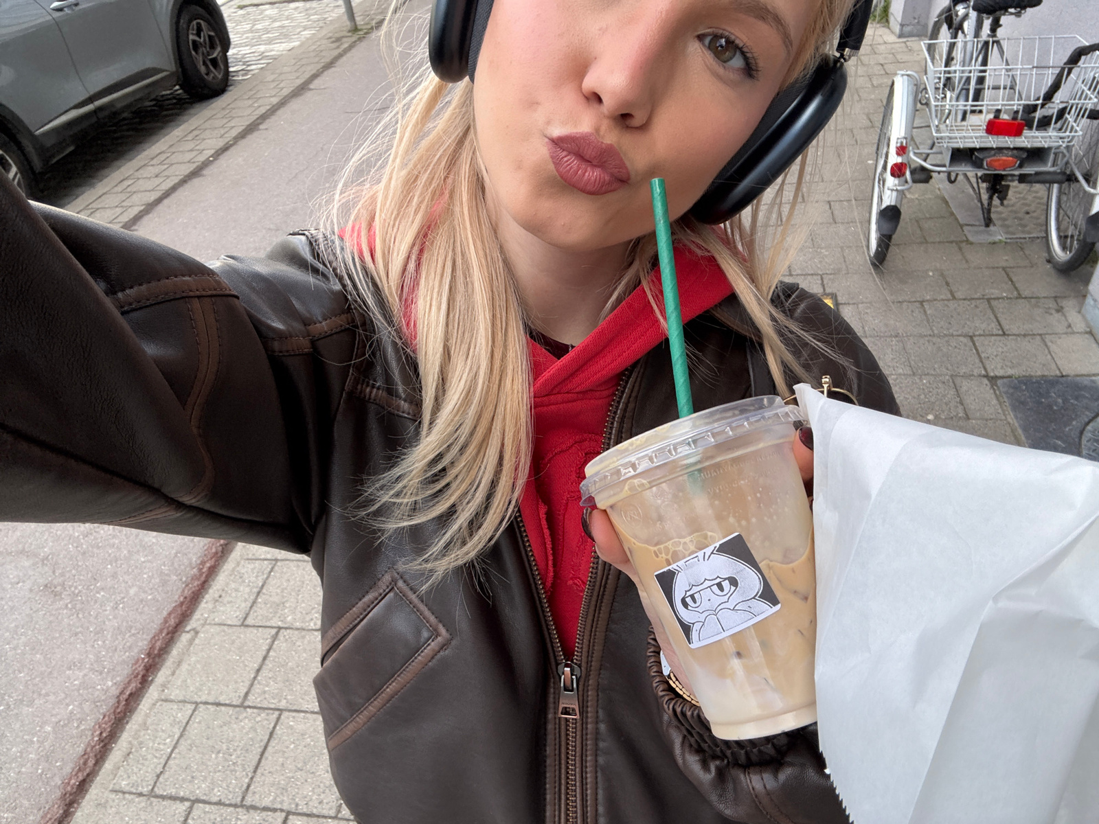 A young woman stands outside holding a coffee drink and a white paper bag. She wears a dark brown leather jacket over a red hooded sweatshirt, and black headphones. She has blonde hair. The coffee cup…read more