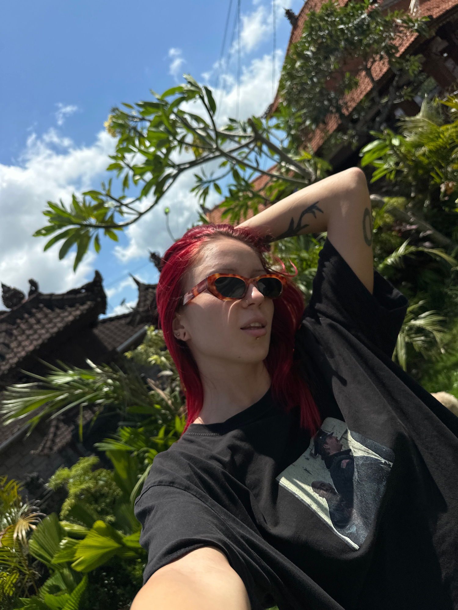 A photograph, taken in North Kuta, Indonesia, shows a fair-skinned individual with red hair, wearing sunglasses and a black t-shirt with a graphic print. The individual is lying down outdoors with an…read more